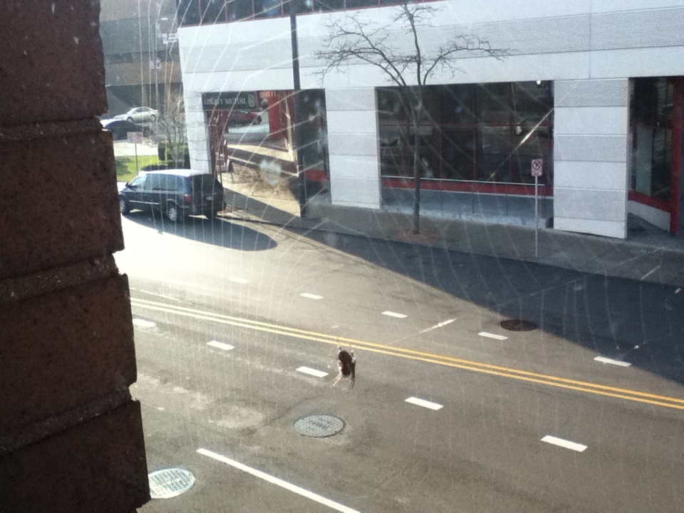 A spider began spinning its webs outside my office window a couple weeks ago.  Although the wind regularly rips the delicate spiral patterns to shreds, new orbs appear in their place within days.  (Click on the photo for a closer look at the web’s individual strands.)