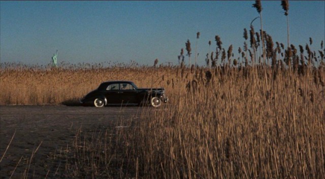 The shot’s composition is also beautiful in the way it employs the “Rule of Thirds.” Not only is the frame divided into vertical thirds – Statue of Liberty in the left third, the car in the center, and tall grass in the right third – but it is also divided into thirds in terms of background, middle ground, and foreground. Not to mention clear blue sky at the top, golden reeds in the middle, and dark earth at the bottom (except for that foreground curtain of seed-feathered, grassy reeds partially screening the vehicle and its occupants from view).