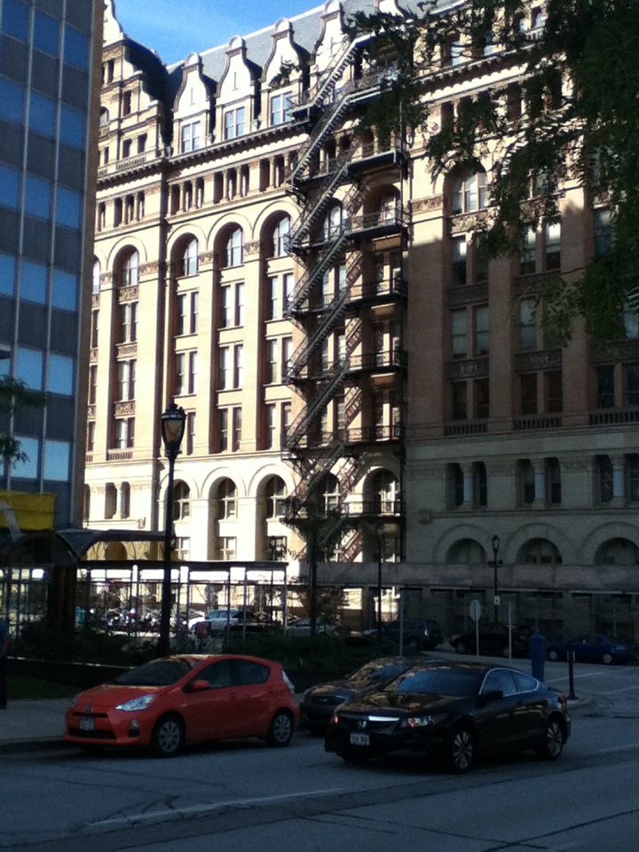 I hope you’re not tired of photos. Because here’s another one I took this morning of the fire escape winding down the side of Milwaukee’s City Hall. The only camera I had with me (again) was my iPod Touch, so I hope you can see what I saw – specifically, the way the fire escape intertwines with its own shadow all the way down, creating a lacy, spiraled pattern that resembles the DNA double helix.