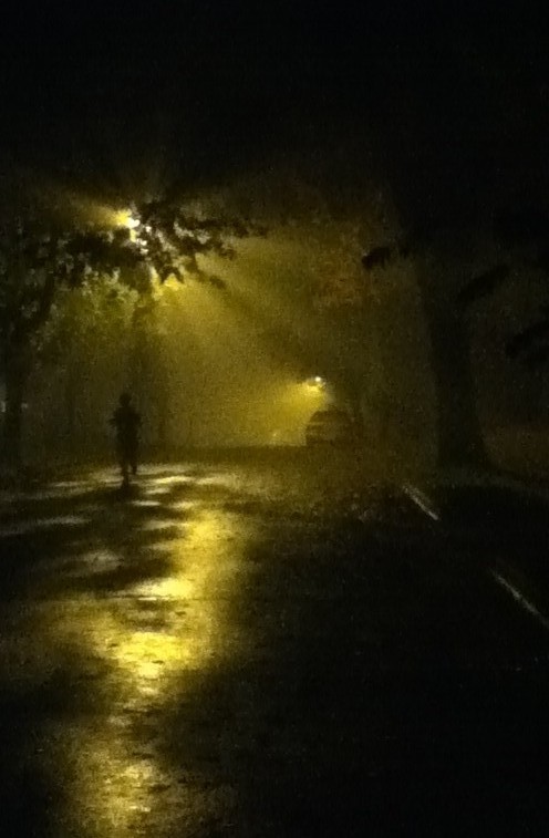 It’s a foggy evening here in Milwaukee.  Only after I’d already taken this photo did I realize that someone was running toward me down the middle of the street.  Kind of an eerie night, but peaceful and quiet.  Nothing except the sound of dripping water . . . and this runner’s footsteps.