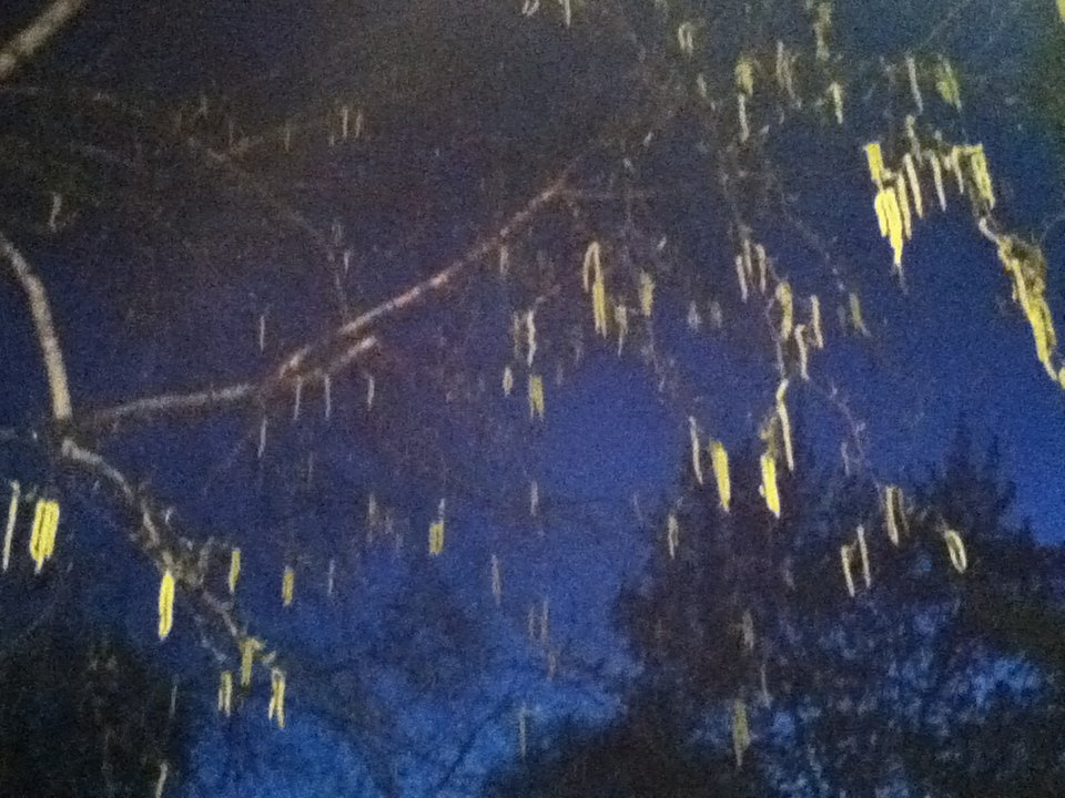 But I do love the look of those drooping catkins.  They remind me of party lanterns strung across a patio.  Last night, illuminated by porch light in the gloaming (love that word :)), they were so striking against the twilight sky that I had to snap this photo.
