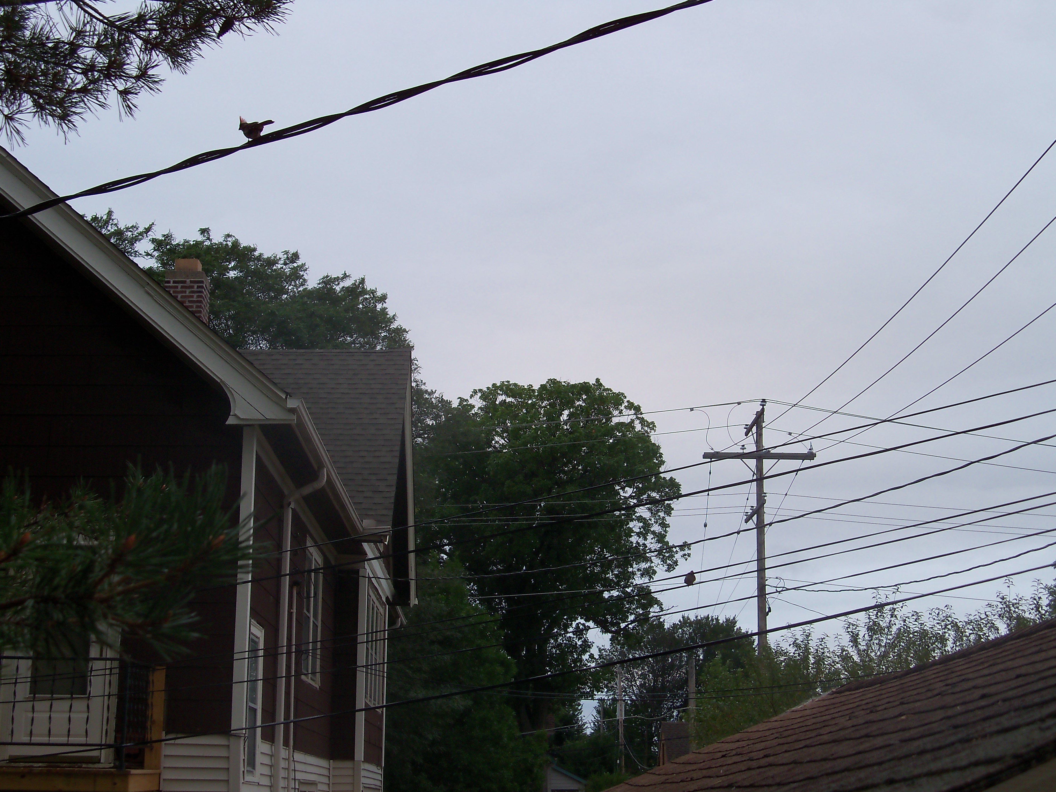 Eventually the baby bird made it all the way down to a duplex at the end of our block, a journey that had taken hours of close supervision from Mom and Dad.  Below is a photo I took in the early evening of our exhausted little adventurer.  In the upper left, you can see Mom perched on a thick line that remained stable under her weight.  Poor Mom.  She kept trying to land closer to Junior, but those thinner lines swayed too much every time she attempted to perch on one.