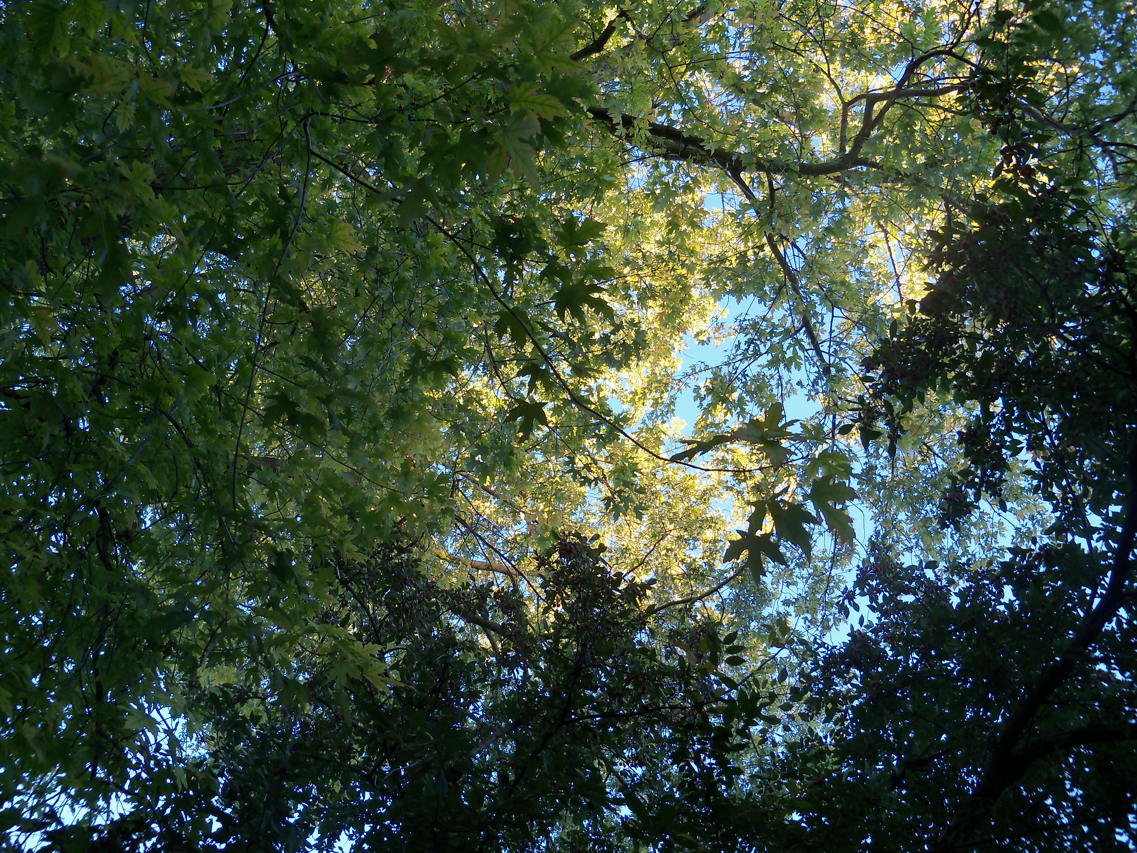 It all depends on your perspective . . . Yesterday I happened to look up through the branches of our crab apple and silver maple trees and saw that the leaves way, way up there were suffused with late-afternoon sunlight.
