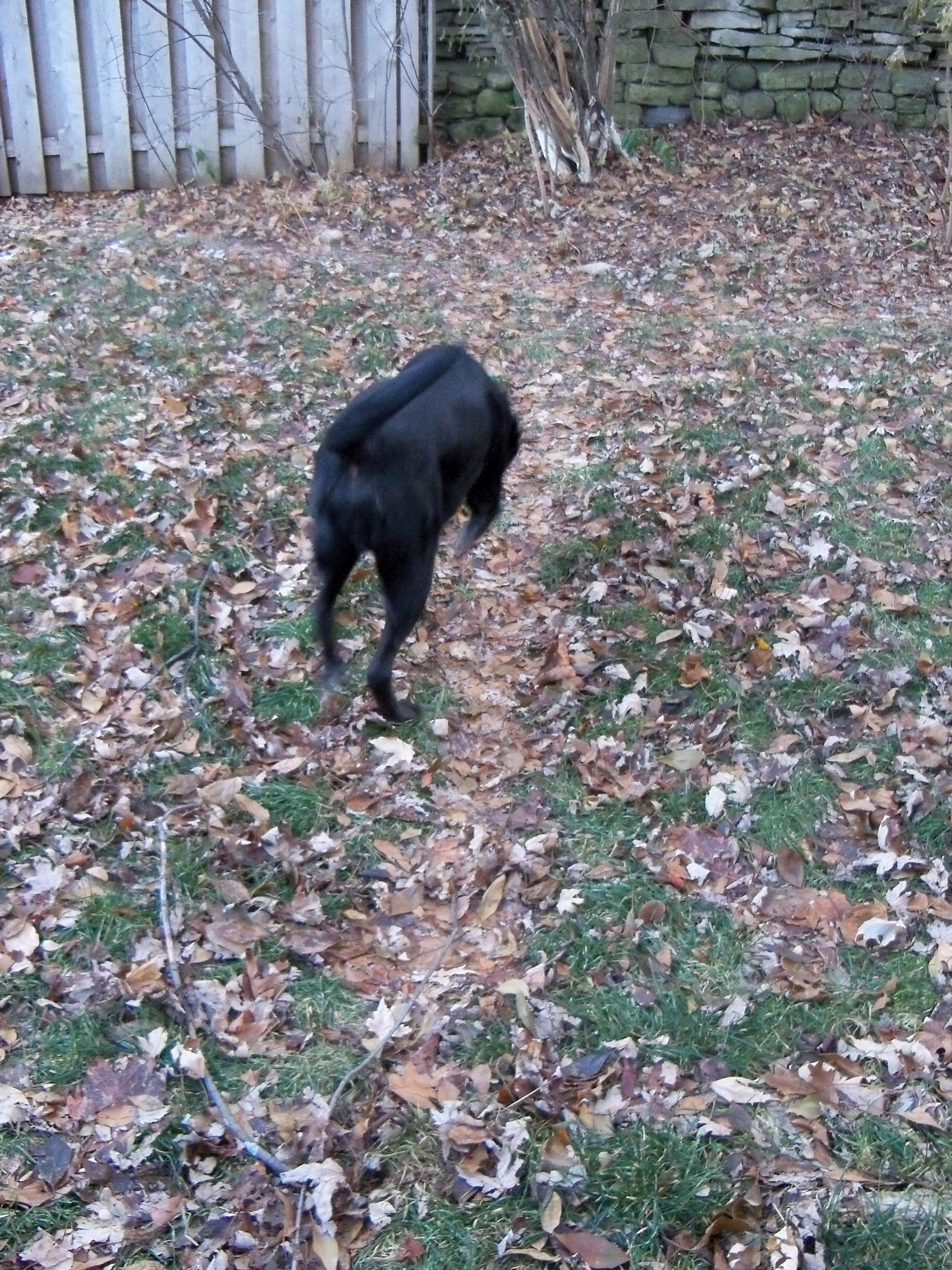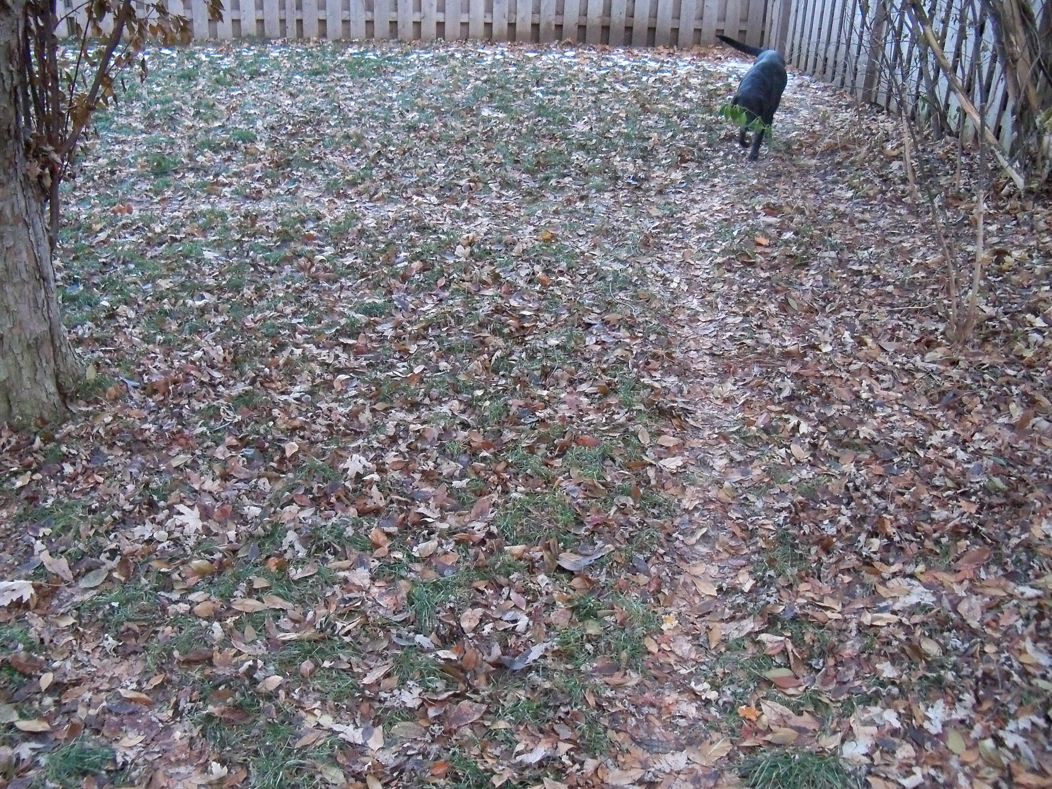 This afternoon I came home from work, fed the dogs, put away groceries, and took out the garbage. All my usual getting-home chores. The snow melted over the weekend, although today is quite cold. So I noticed when I went outside that our dogs’ trails/paths through the yard are quite visible, even now when the grass is matted down and frozen and covered by leaves. (Yes, we raked, but it snowed before all the leaves had a chance to fall. Leaves are still falling!)