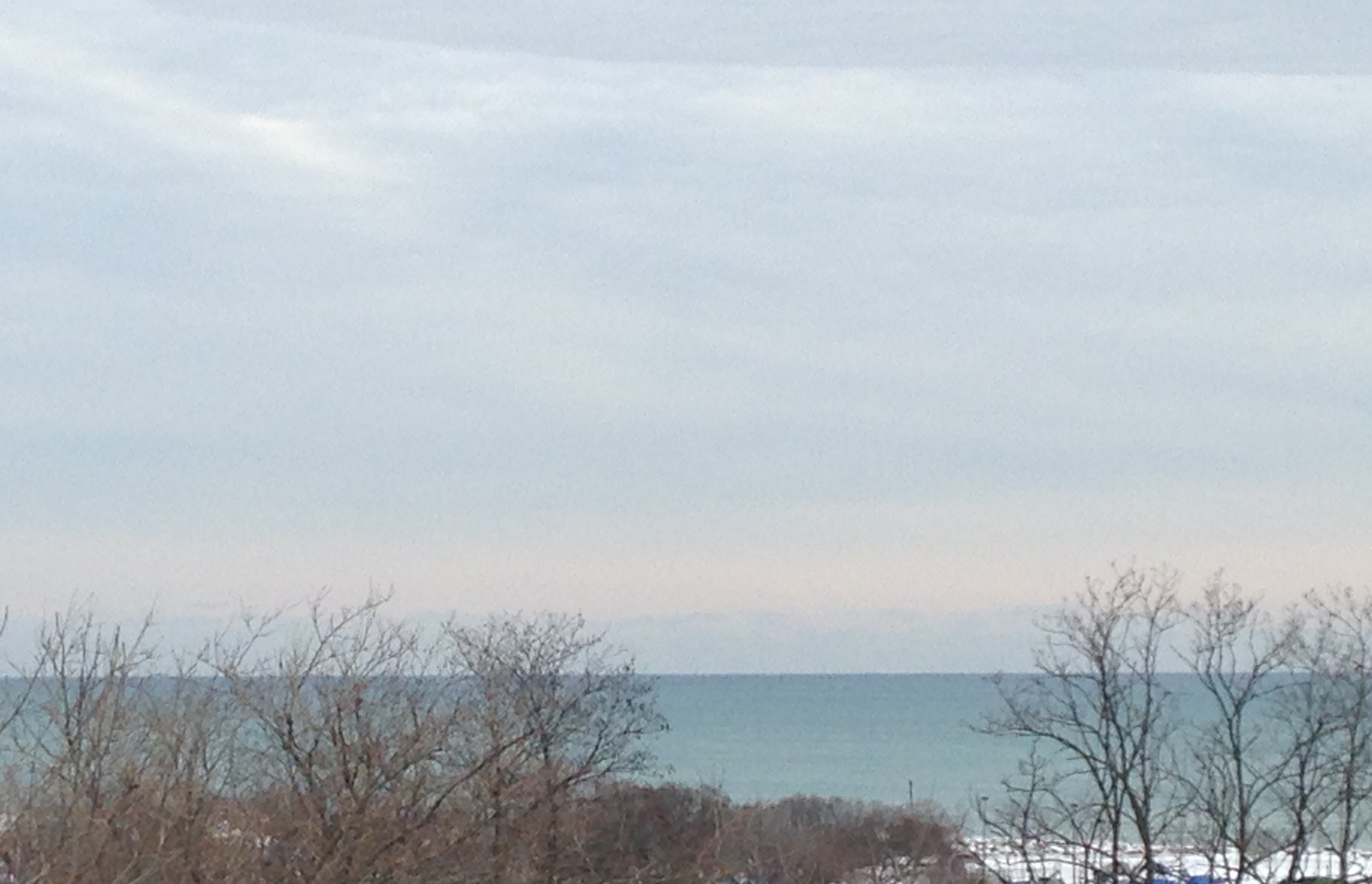 Lake Michigan looks different every day, which might come as a surprise to people who have never lived near a large body of water. I just noticed the barely-visible line of clouds low on the horizon. Although it appears you’re seeing distant cliffs or mountains across the water, it’s really just the low-pressure weather system moving east. You can’t see the Michigan shoreline from Milwaukee. It’s too far away on the other side of the lake.