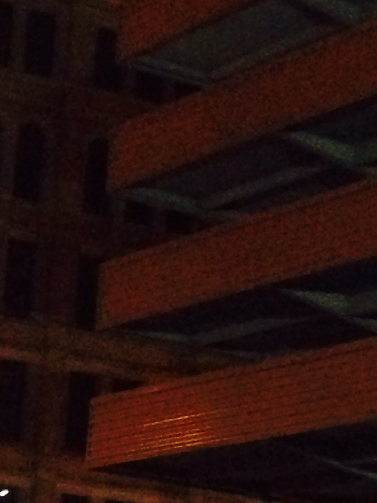 I attended a party/dinner downtown last night with my husband, and as he paid for our parking, I noticed the interesting juxtaposition of lines at the spot where a parking garage met an old office building. Night colors are always off and sort of reddish in iPhone photos, but I liked the result.