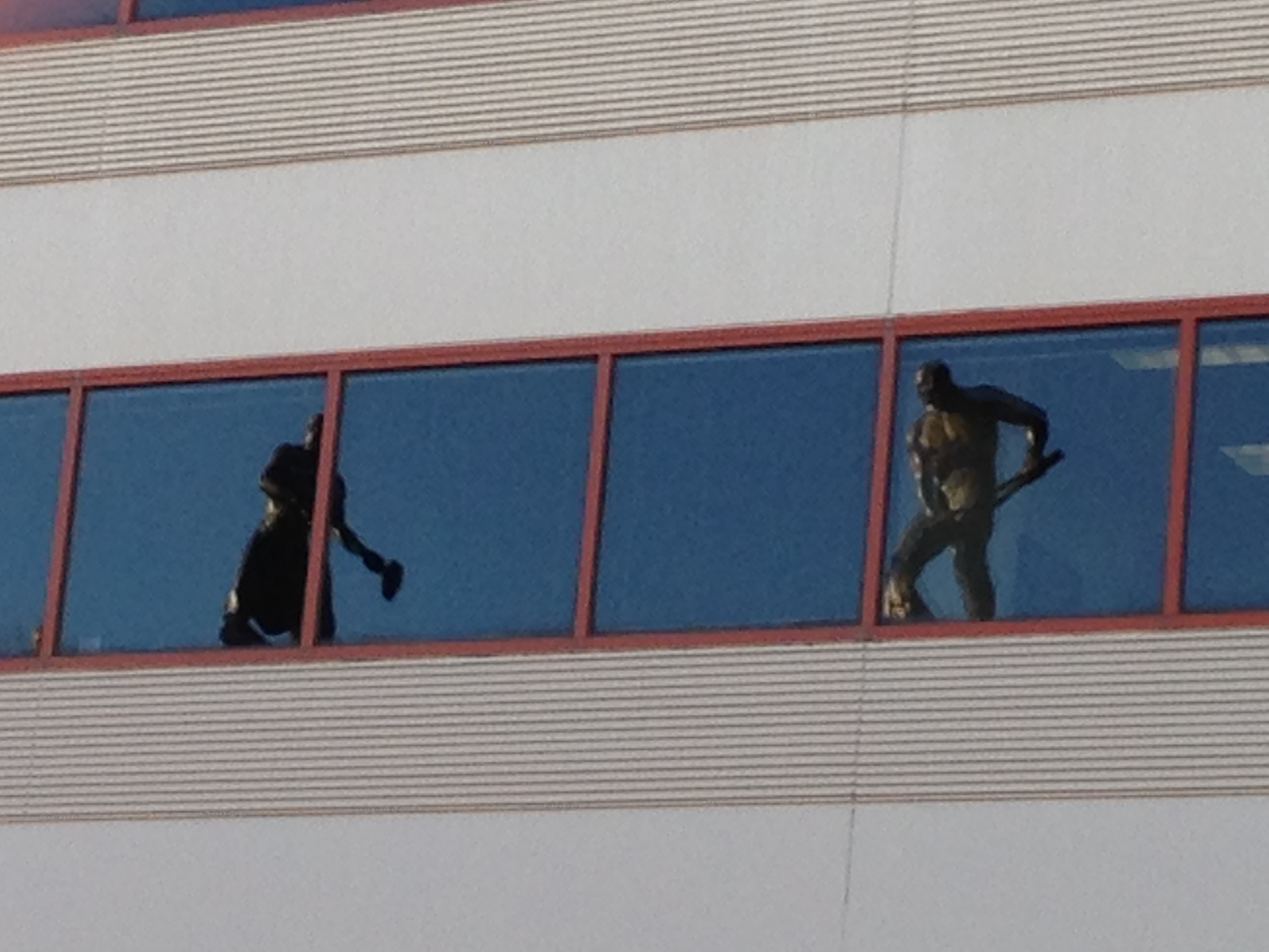 As I was walking into my building this morning, I saw this reflection in the windows of the office building across the street. When I saw the statues’ silhouettes in the glass, I decided to take a picture.