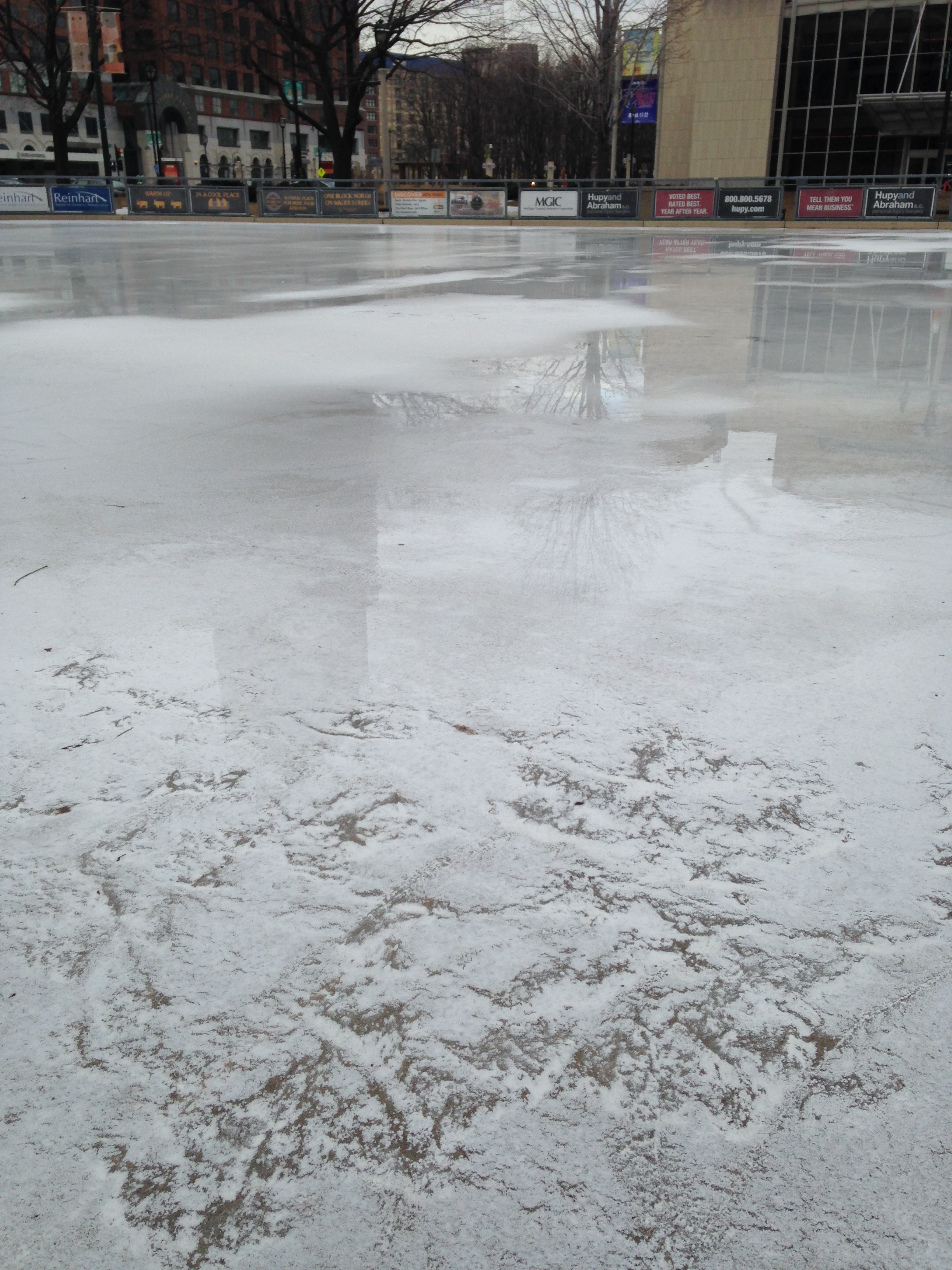 Last week Friday the temperature was 0º on our back porch thermometer when I let the dogs out first thing in the morning.  Today the high is supposed to hit 63º.  Quite a change, (to which my sinuses can attest 🙂 ).  Standing water and glimpses of cement through the ice at the rink in Milwaukee’s Red Arrow park greeted me when I made a Starbucks run earlier this morning.  A welcome sign that this winter is just about over!