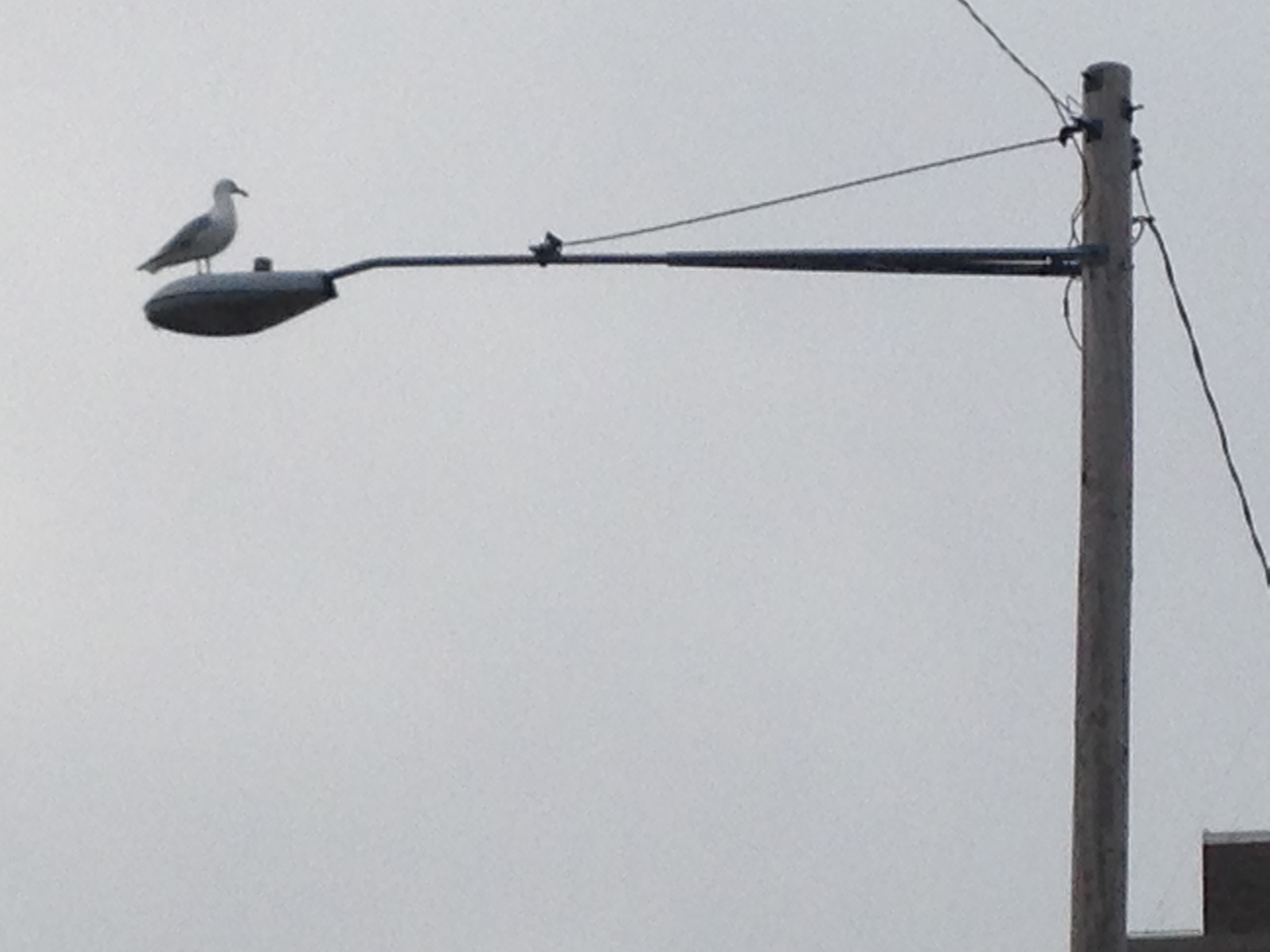 I noticed this bird atop a light pole as I left campus tonight. Downtown Milwaukee has been partially shrouded by mist/fog today, most likely caused by the difference between air and Lake Michigan temperatures. Away from the lake it was warm and sunny.