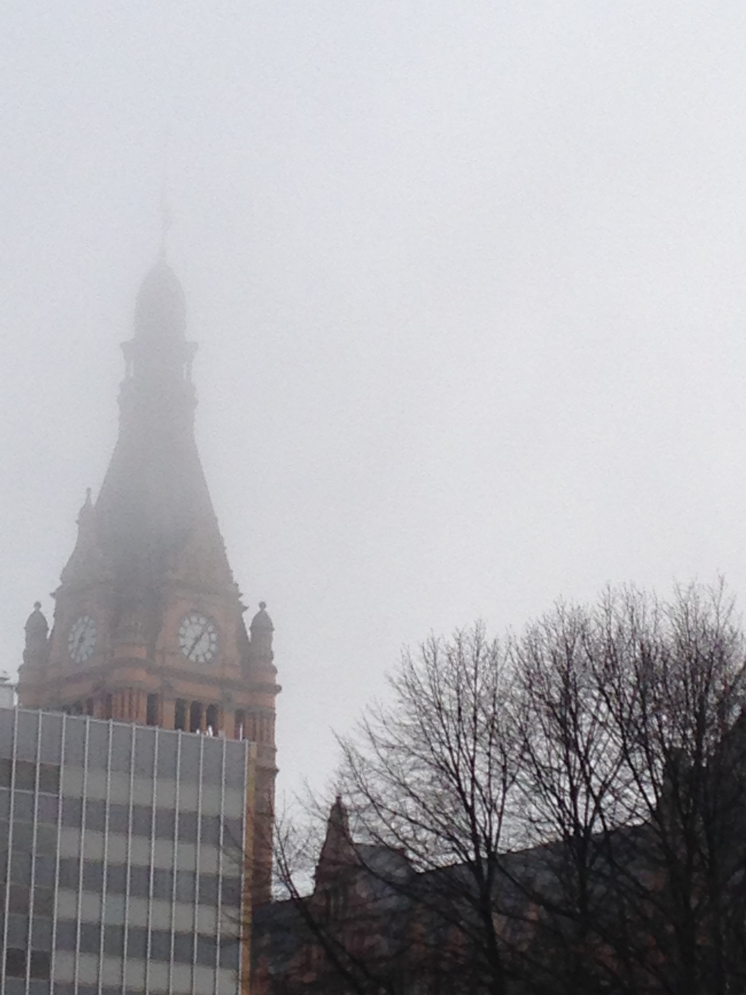 Below is City Hall, the bell tower and flag vanishing into the mist. On days like this, the top two-thirds of skyscrapers are swallowed by fog. It’s very strange to be high up in one of these buildings and look out at nothing but gray fog pressing against the windows. Kind of claustrophobic.