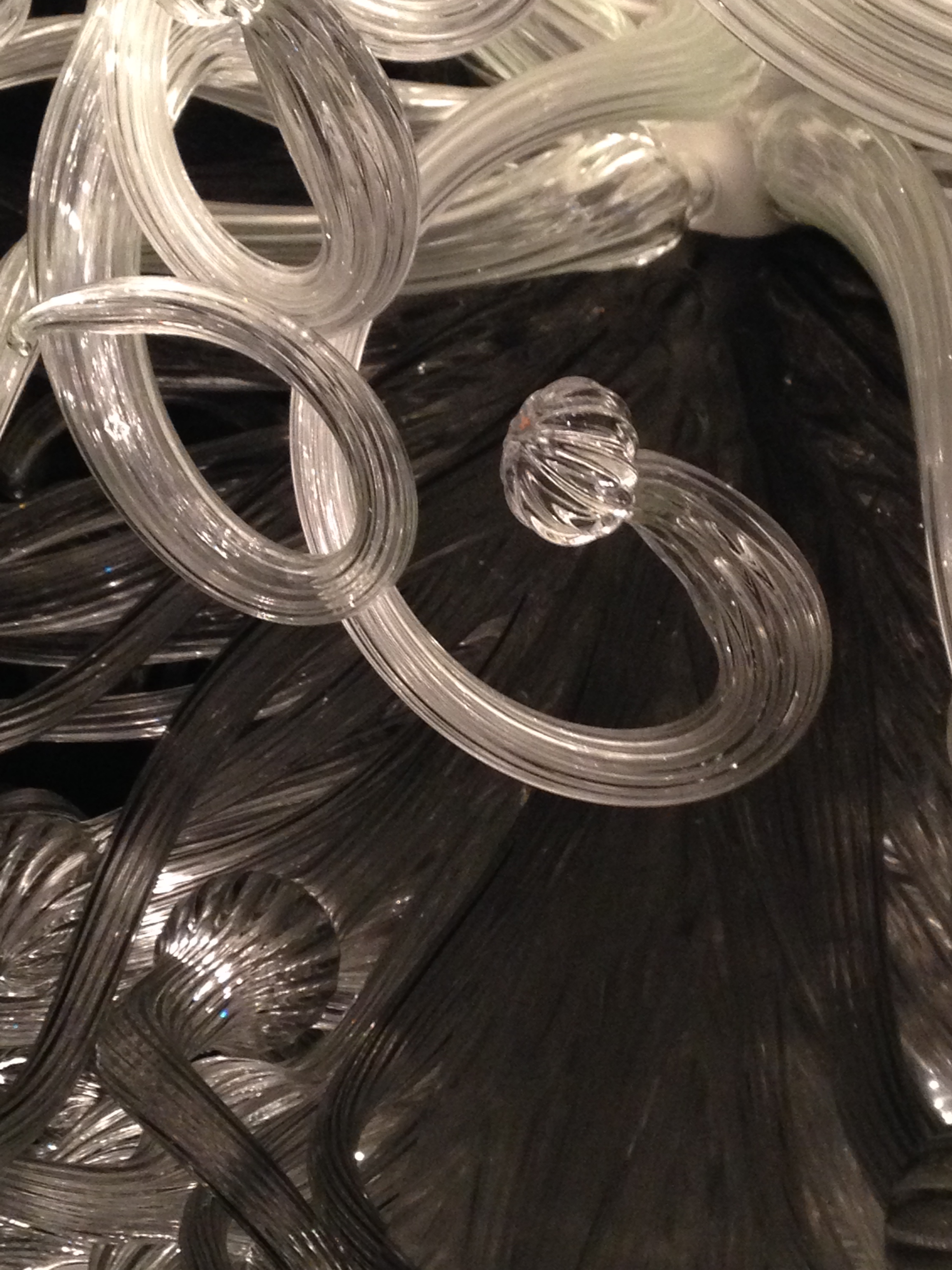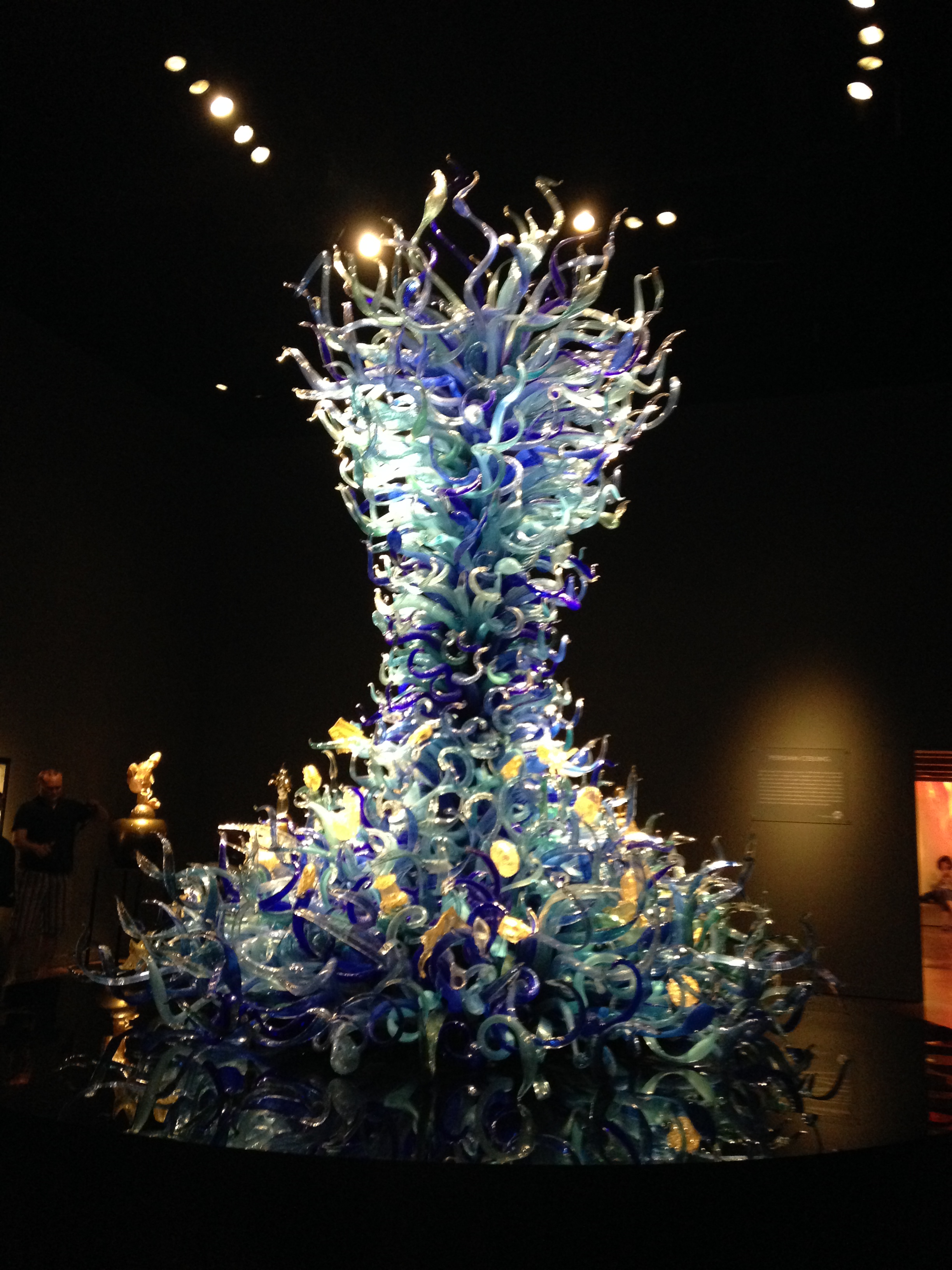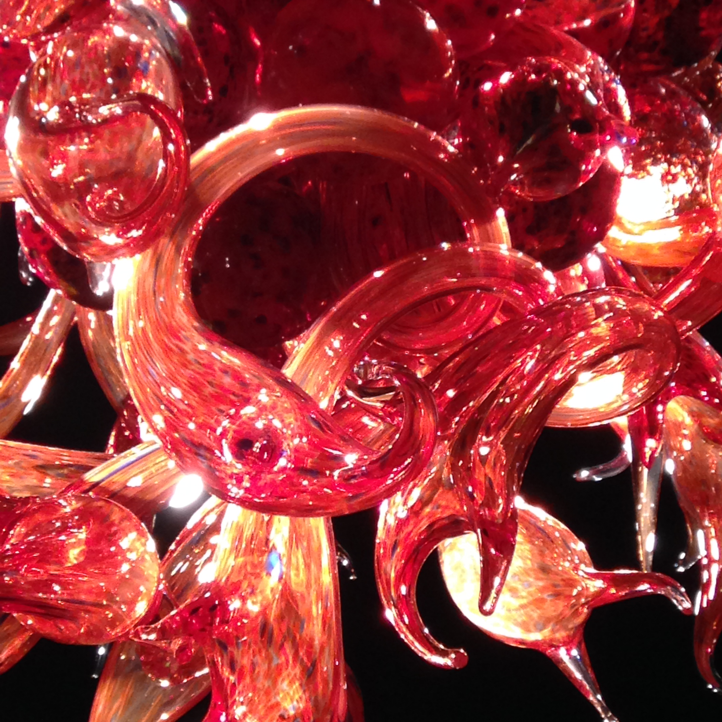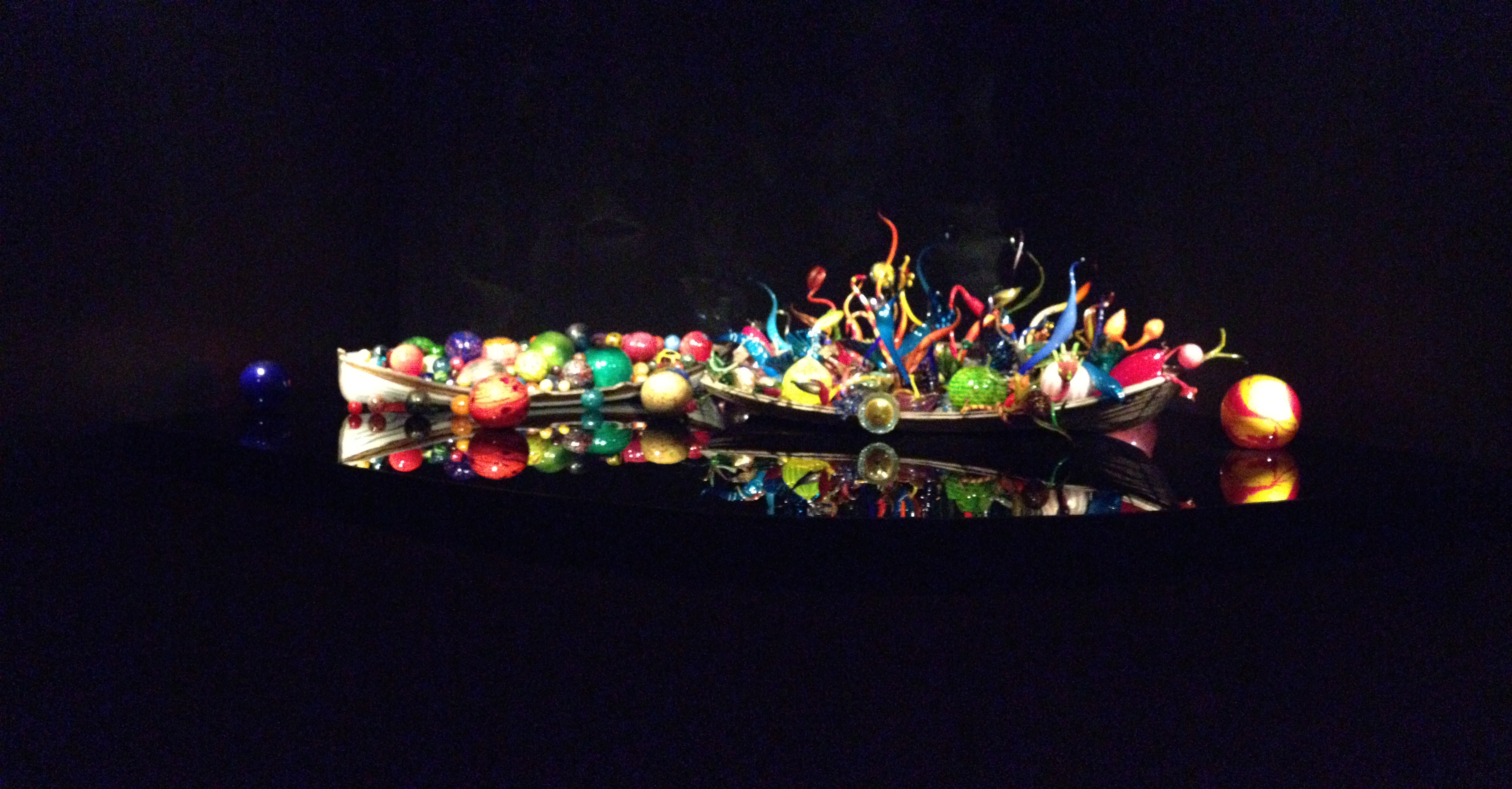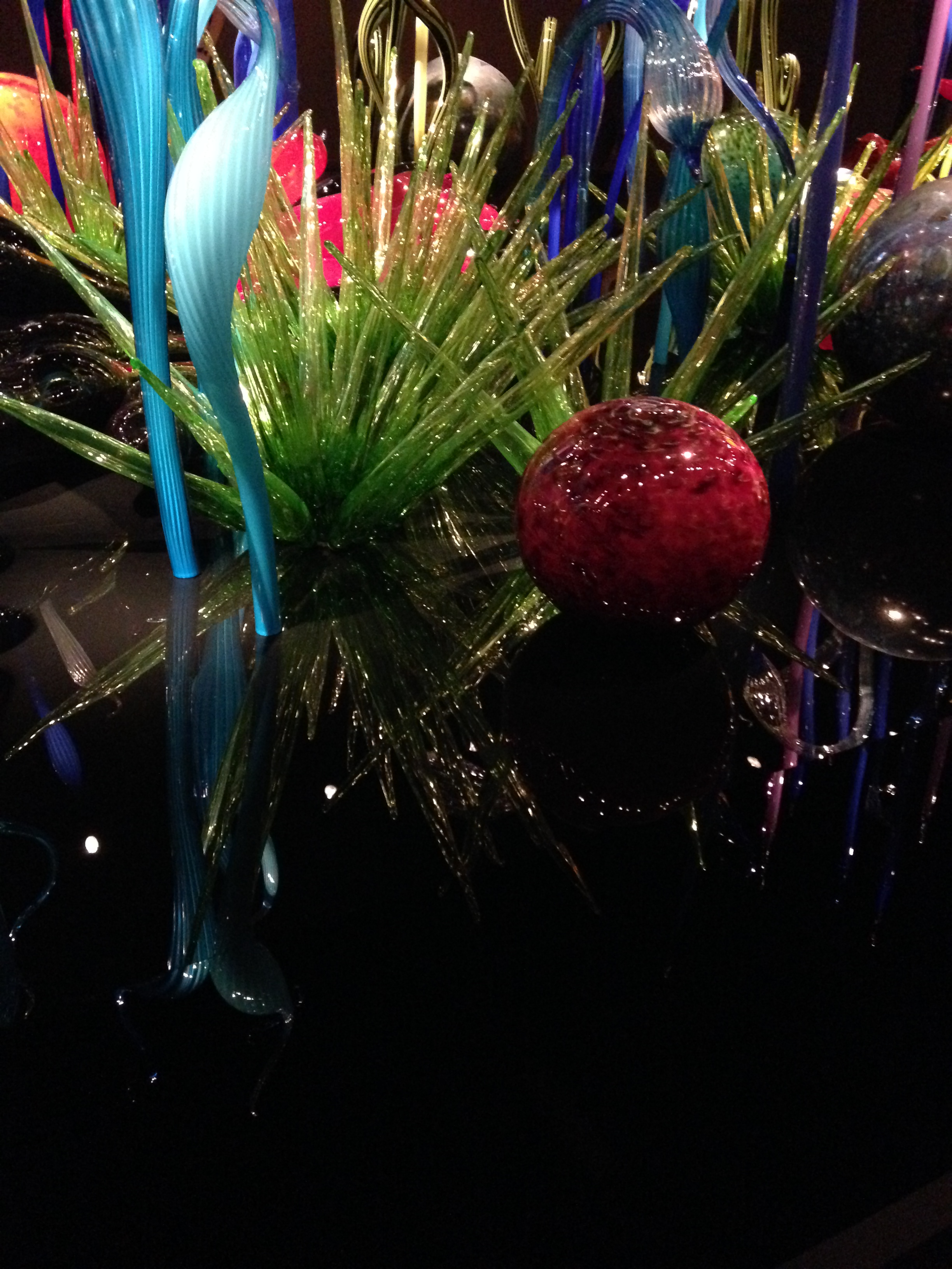 You probably noticed the reflections in the pictures above. Chihuly is famous for hanging his glass chandeliers above water. For a wonderful intro to his work if you’re not familiar with Chihuly, see Chihuly Over Venice, a 90-minute documentary about his 1996 installation of chandelier sculptures over the canals of Venice (you can view a sample/trailer here, at Chihuly’s website). Once you see the glass reflected in the dark water, you’ll understand as I did why his work in museums always seems to be placed above a polished, black reflective surface. The mirror image is as important to the viewer’s experience as the sculpture itself.