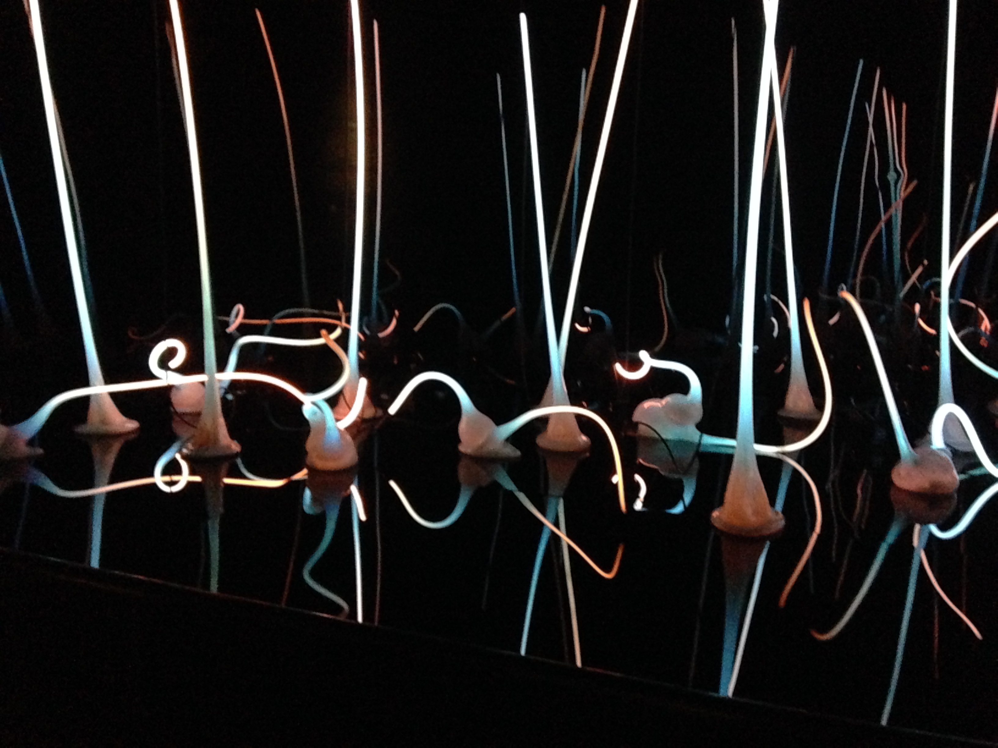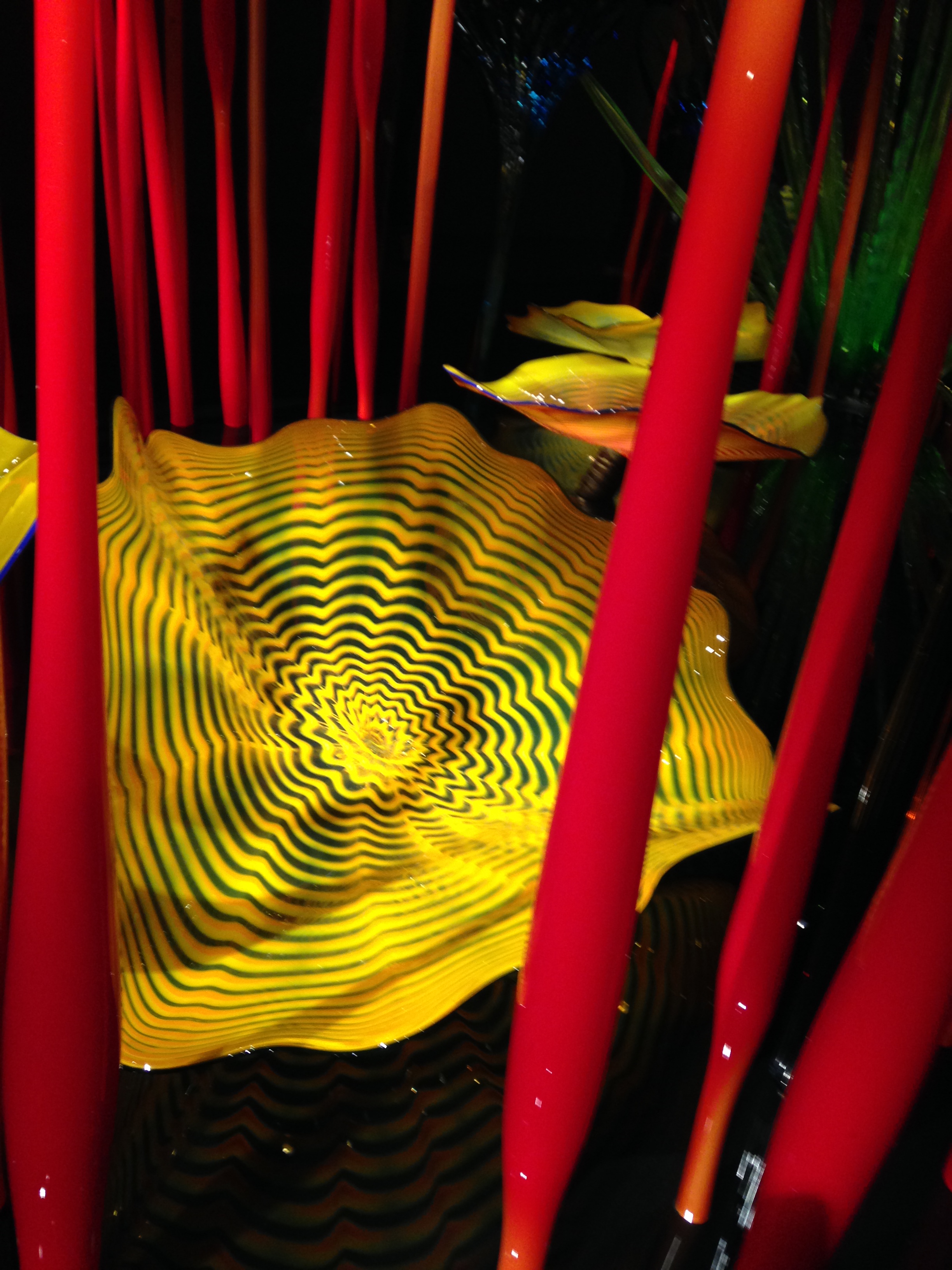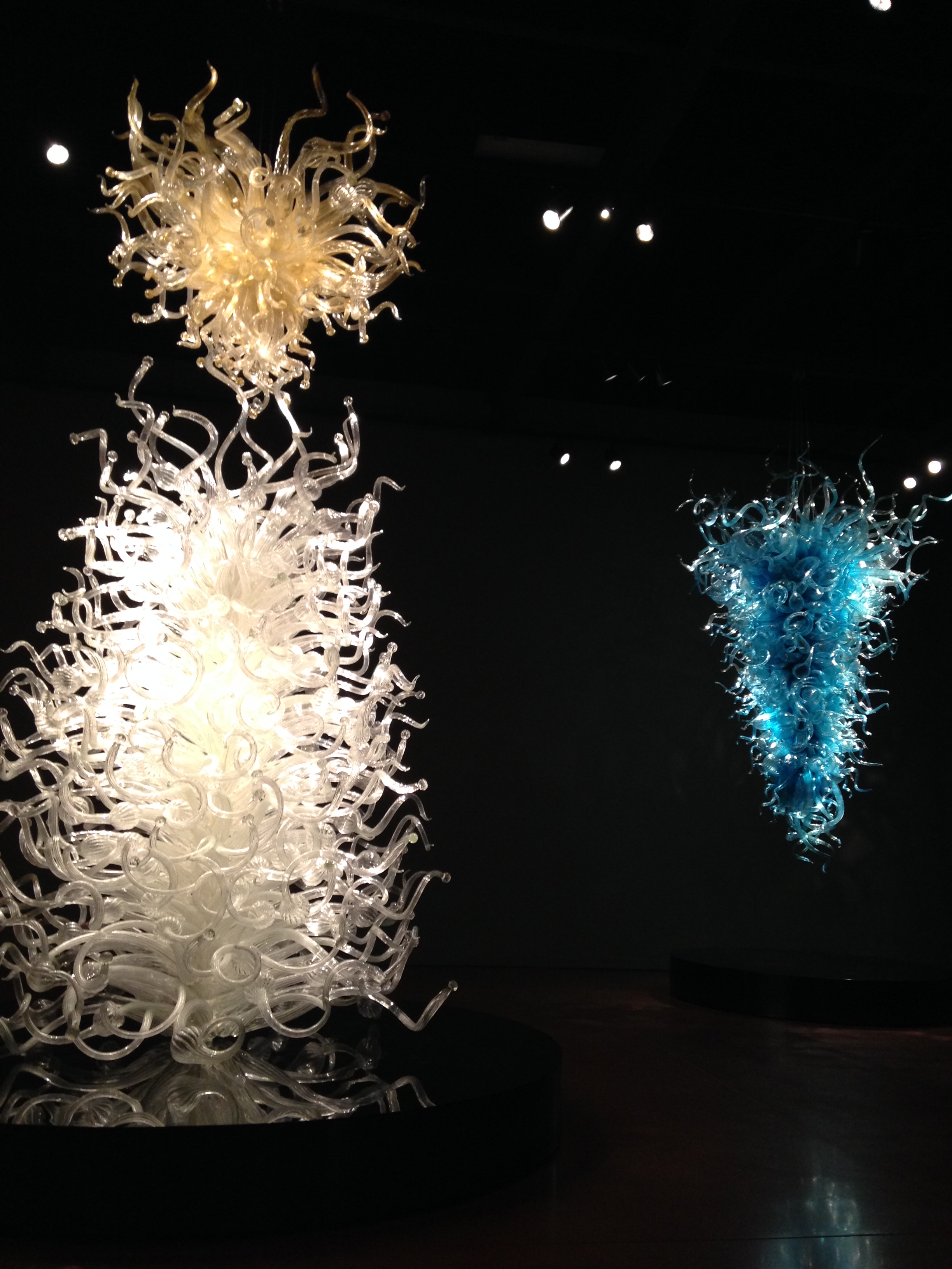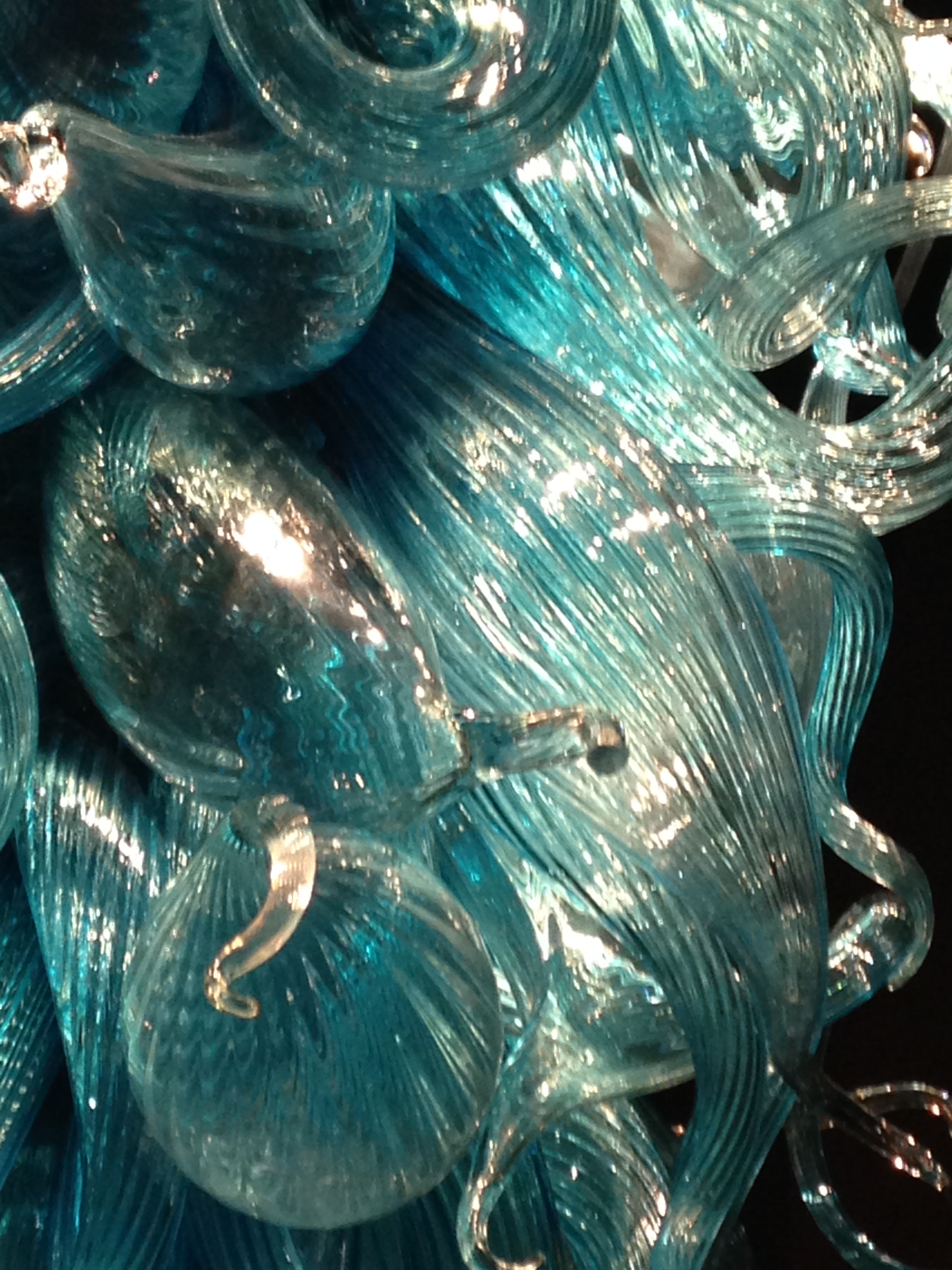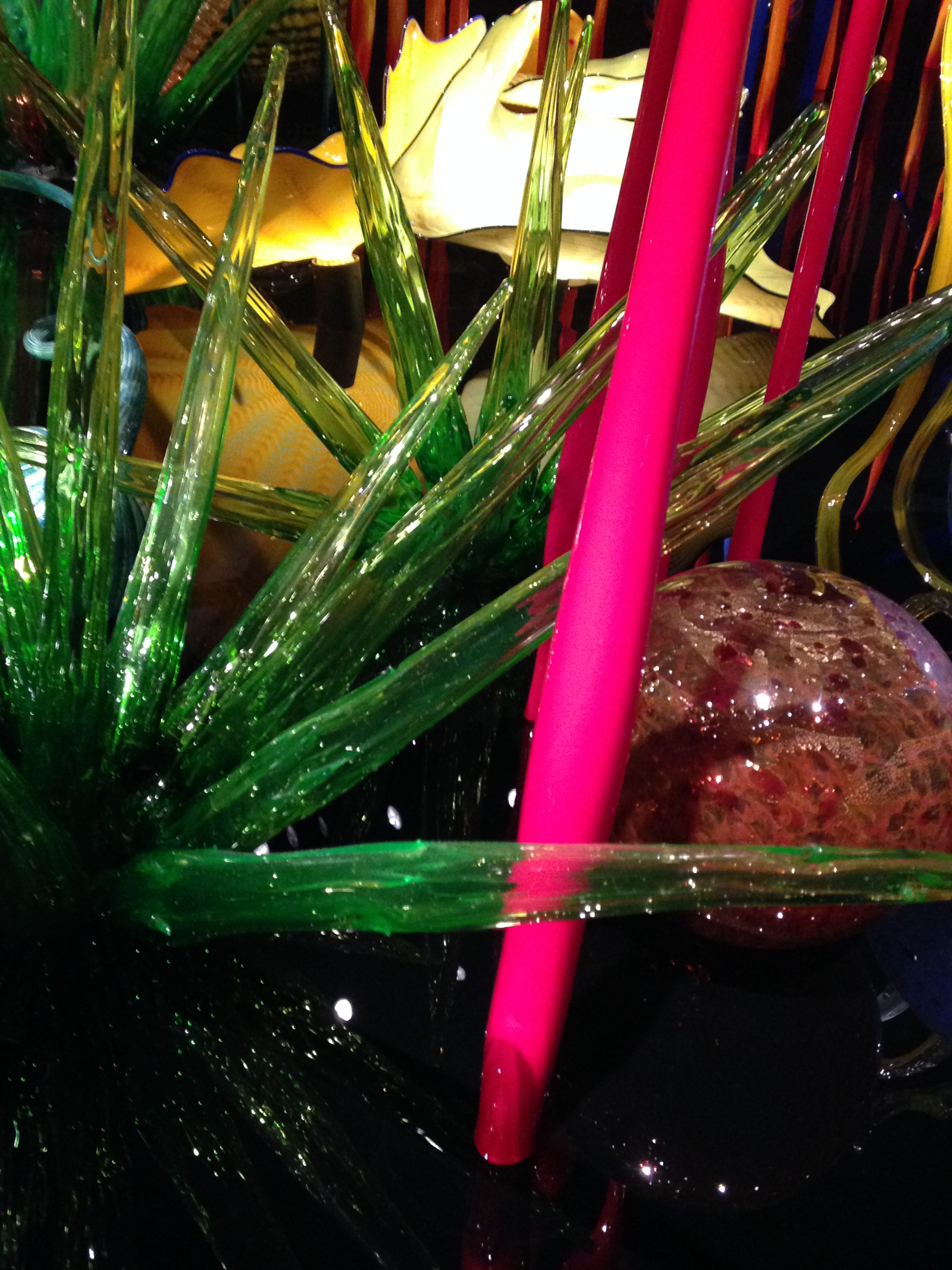 You probably noticed the reflections in the pictures above. Chihuly is famous for hanging his glass chandeliers above water. For a wonderful intro to his work if you’re not familiar with Chihuly, see Chihuly Over Venice, a 90-minute documentary about his 1996 installation of chandelier sculptures over the canals of Venice (you can view a sample/trailer here, at Chihuly’s website). Once you see the glass reflected in the dark water, you’ll understand as I did why his work in museums always seems to be placed above a polished, black reflective surface. The mirror image is as important to the viewer’s experience as the sculpture itself.