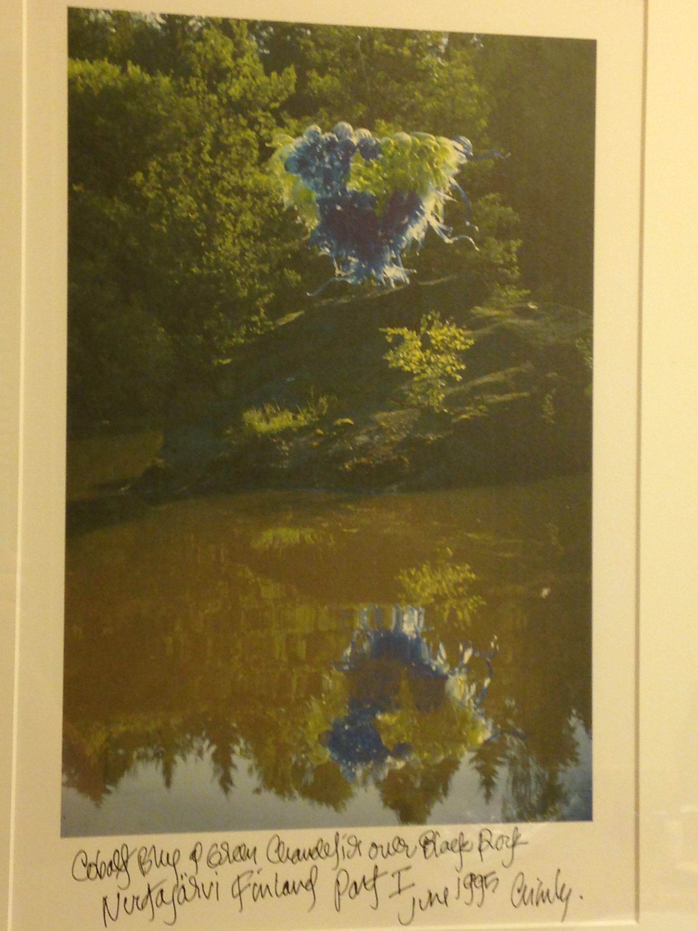 Dale Chihuly was born in Tacoma and is now based in the Seattle area, so maybe it’s no surprise that the bath in our hotel room was graced with this photograph bearing Chihuly’s handwritten caption: “Cobalt Blue & Green Chandelier over Black Rock, Nuutajävi Finland Part I, June 1995.”