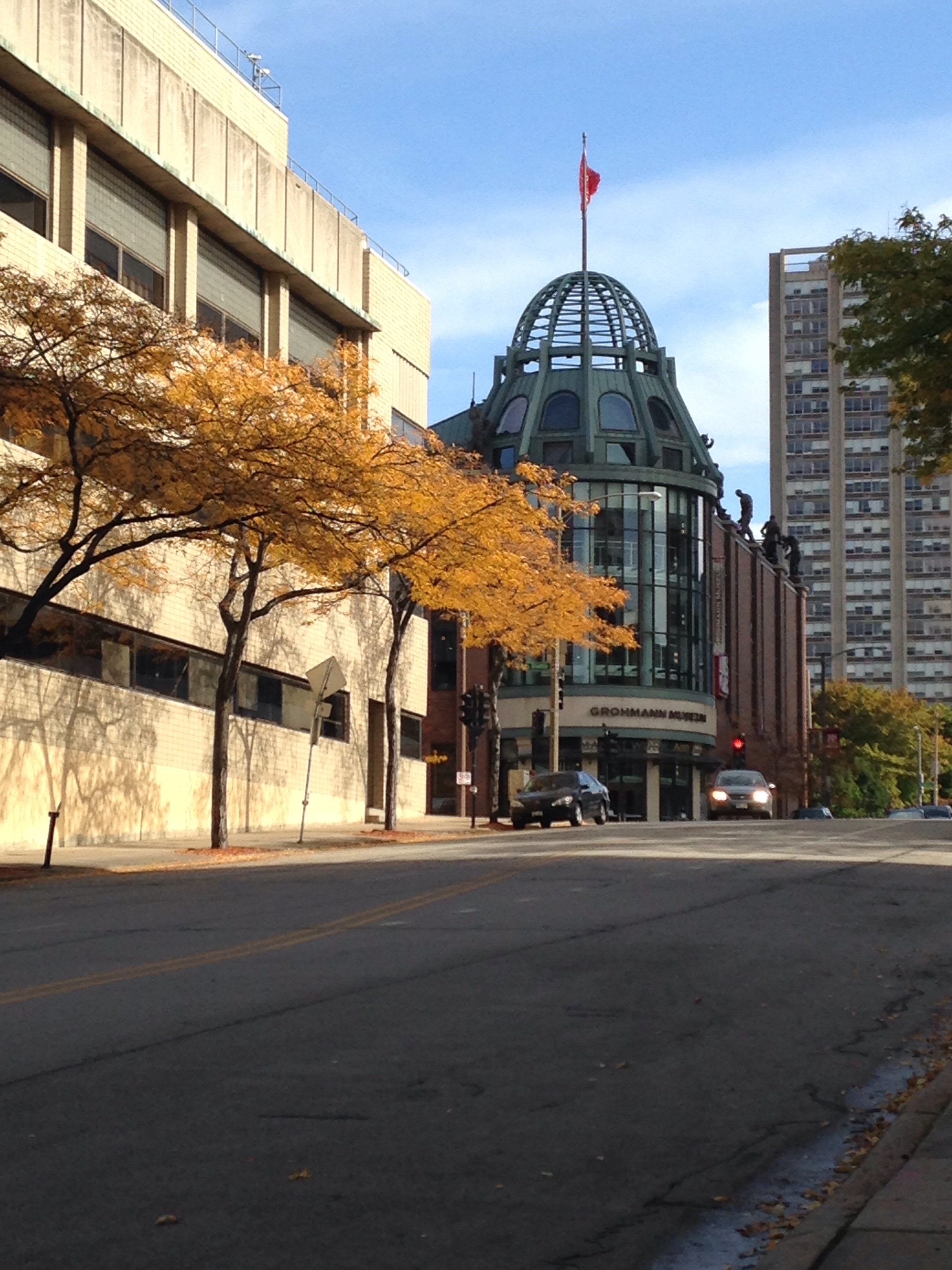 Looking east on State Street in downtown Milwaukee. I love the yellow leaves of the locust trees against the red brick and green dome of the Grohmann.