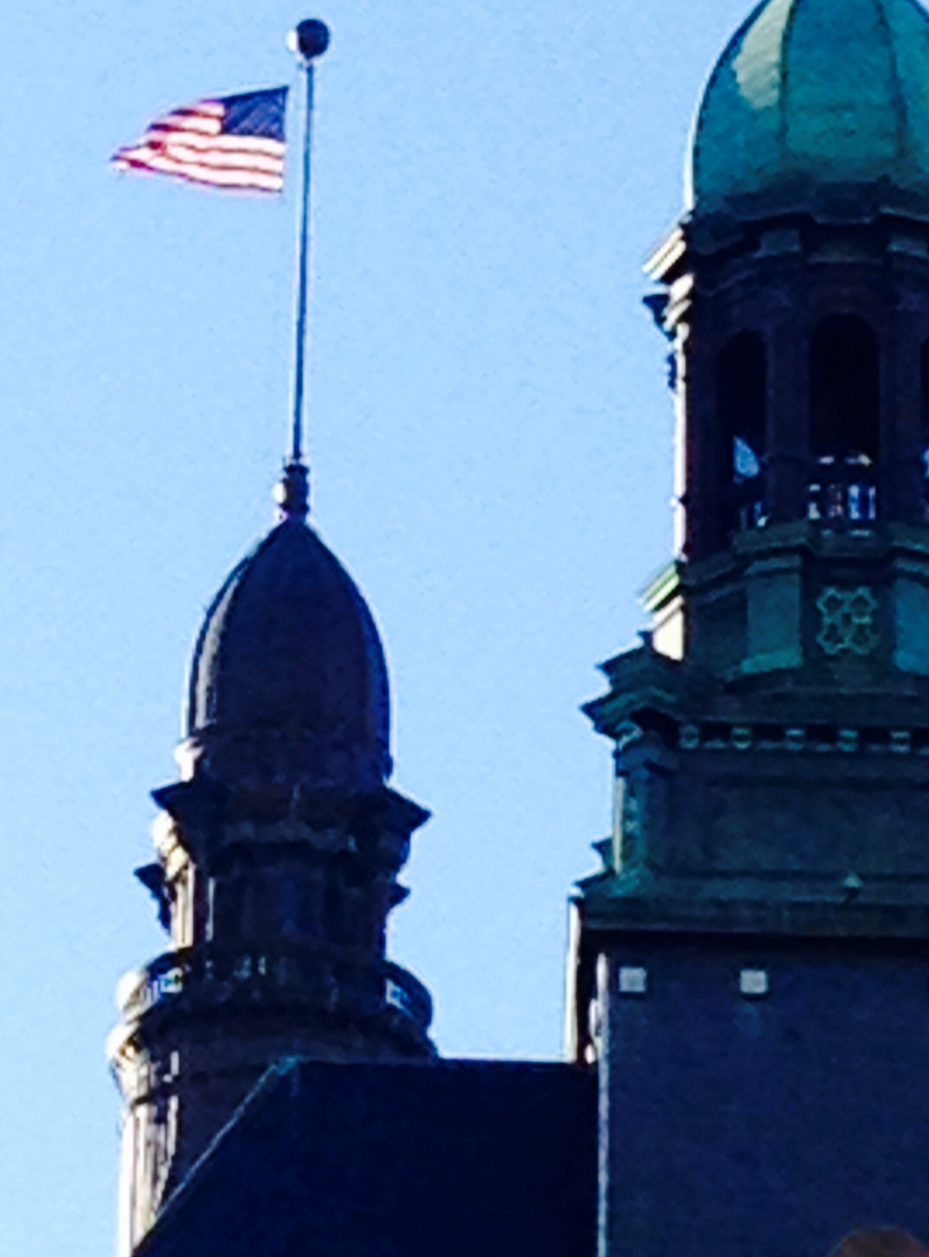 Taken with my iPhone this morning on my way to work. Very grainy, I know (there’s only so “close-up” you can get with a phone!), but I loved the sharp rims of white sunlight along the eastern edge of City Hall’s two towers. So for what it’s worth, I thought I’d post and share 🙂