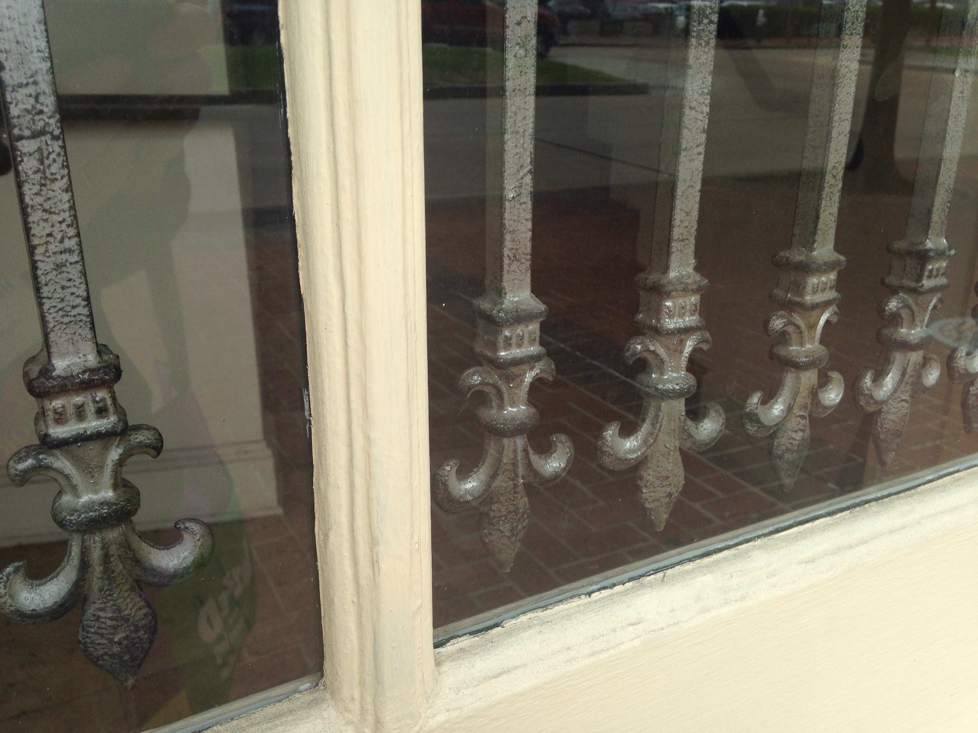 and its lovely ornamental security bars on the doors/windows of the adjoining section of the restaurant, actually an adjacent building, that lacks shutters.