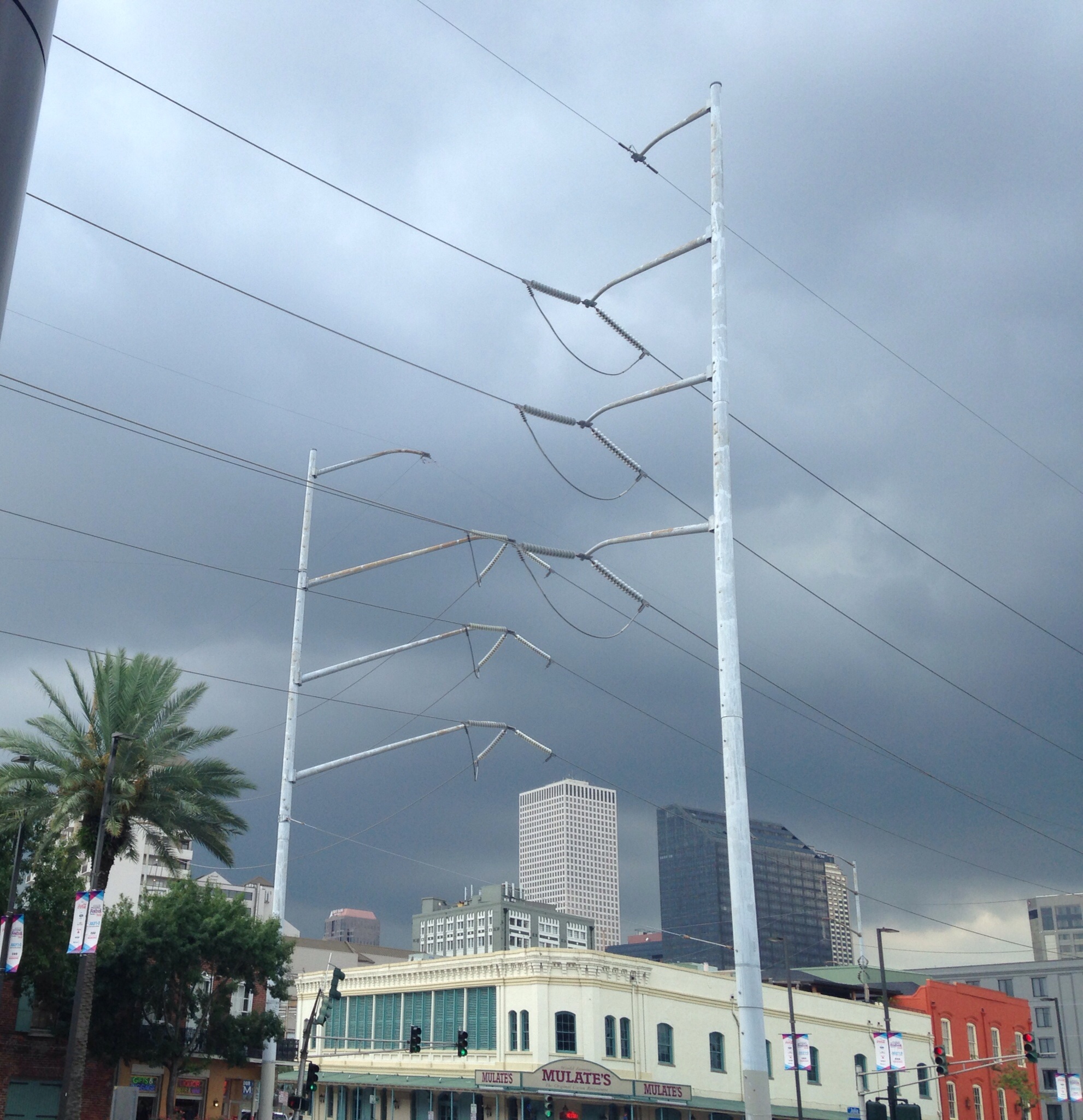 I took this photo as I left the convention center yesterday. I was struck by how white those poles were against the dark gray of the storm clouds above the city. Note the palm tree in the lower left of the picture. I had lunch with my co-author, Cindy, at the restaurant you can just make out at the bottom of the photo, Mulate’s.