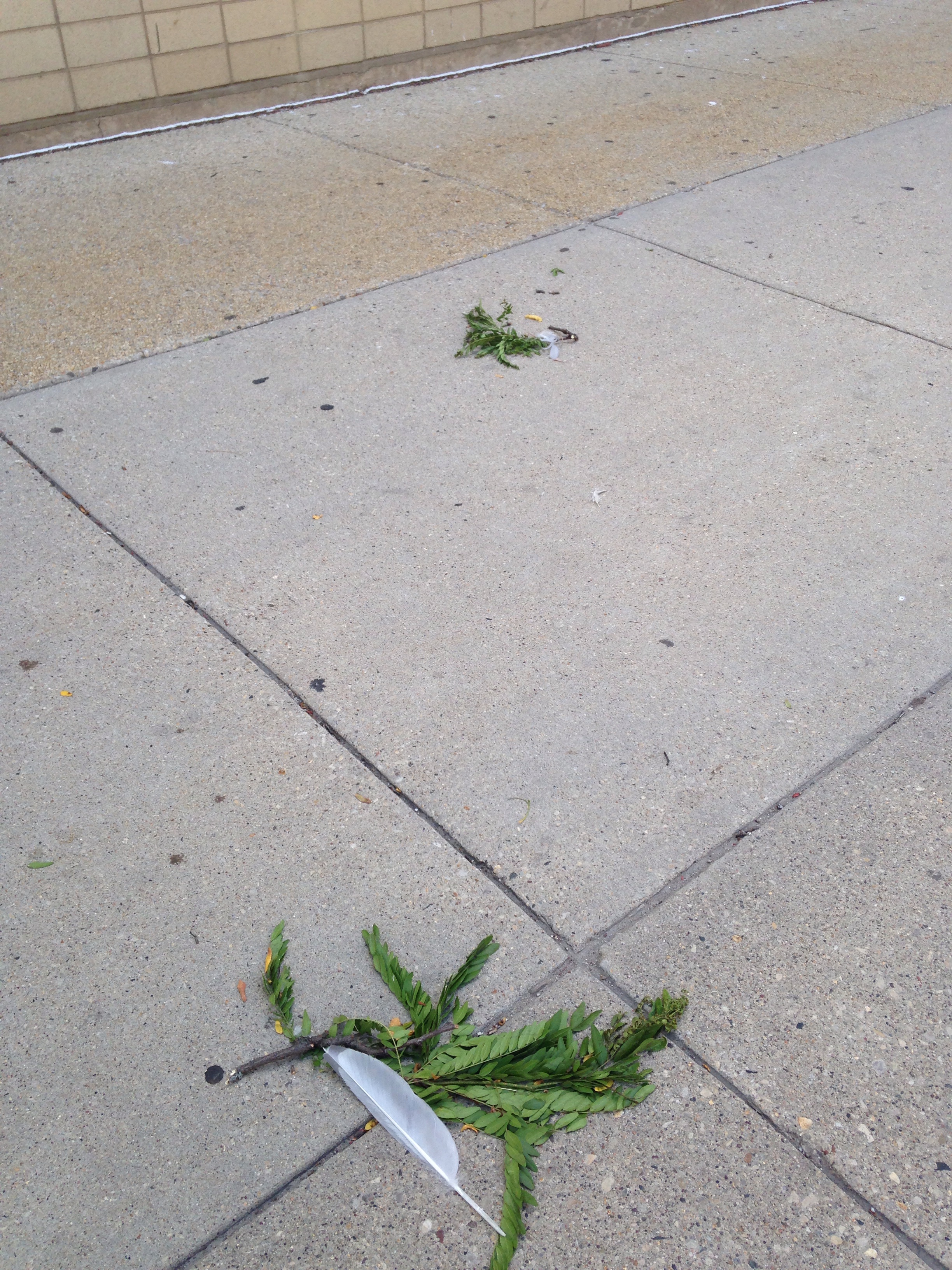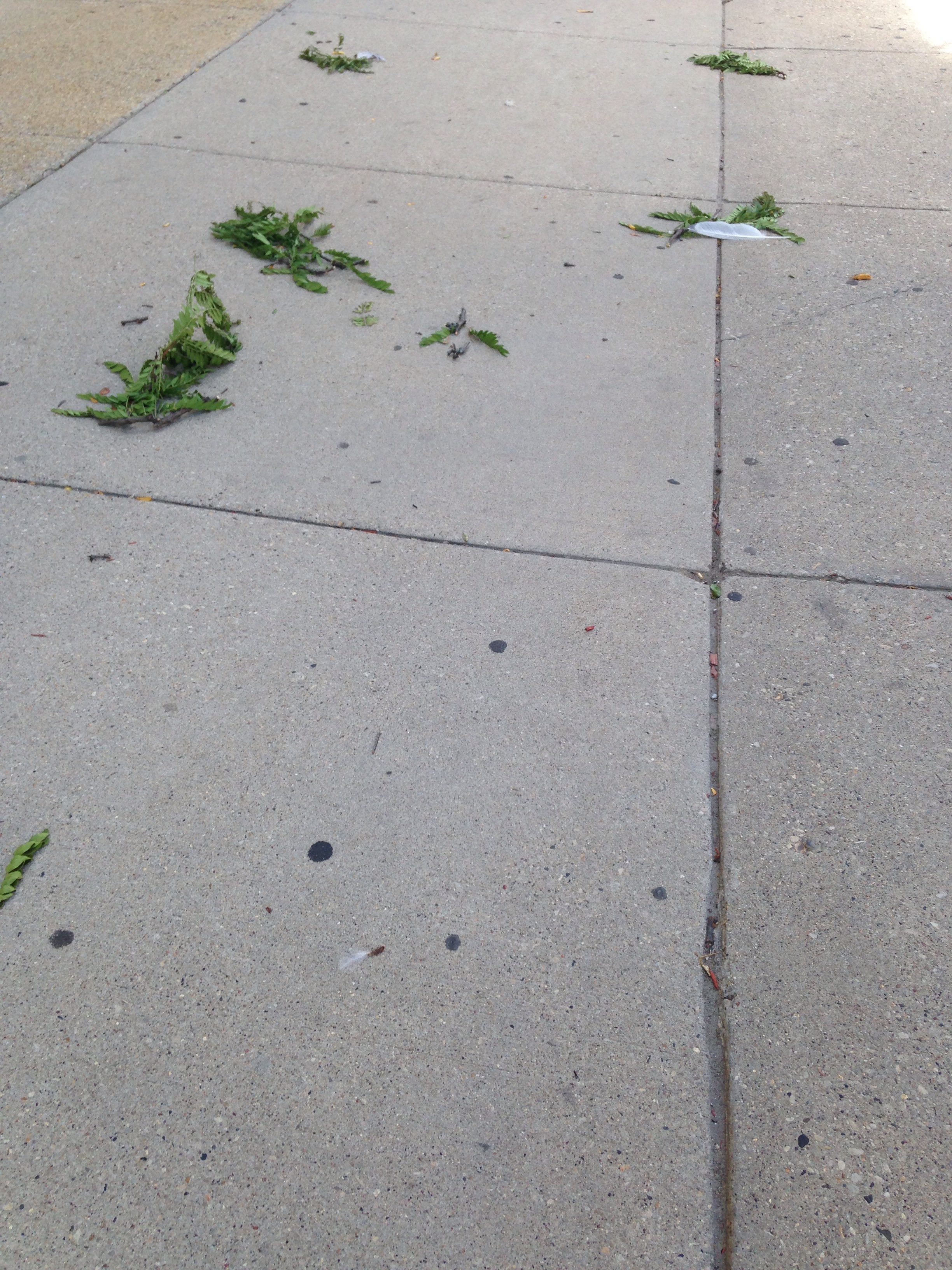 You can see feathers and branches scattered along 50 feet of sidewalk. Not shown are the branches in the street between and under parked cars.