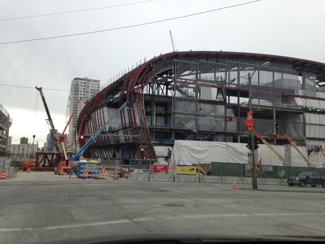Update: As I pressed “Publish,” I noticed for the first time what looks like will be a spot for a skywalk connecting the arena with the parking garage immediately to the north (or, in this photo, to the left). See where there’s a square space in the middle of all that curved steel?