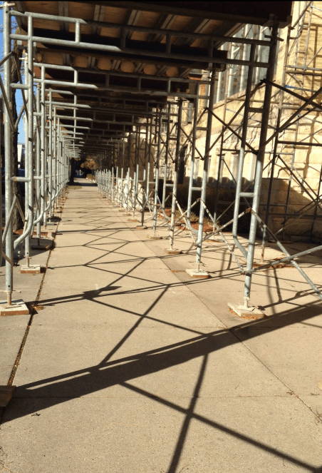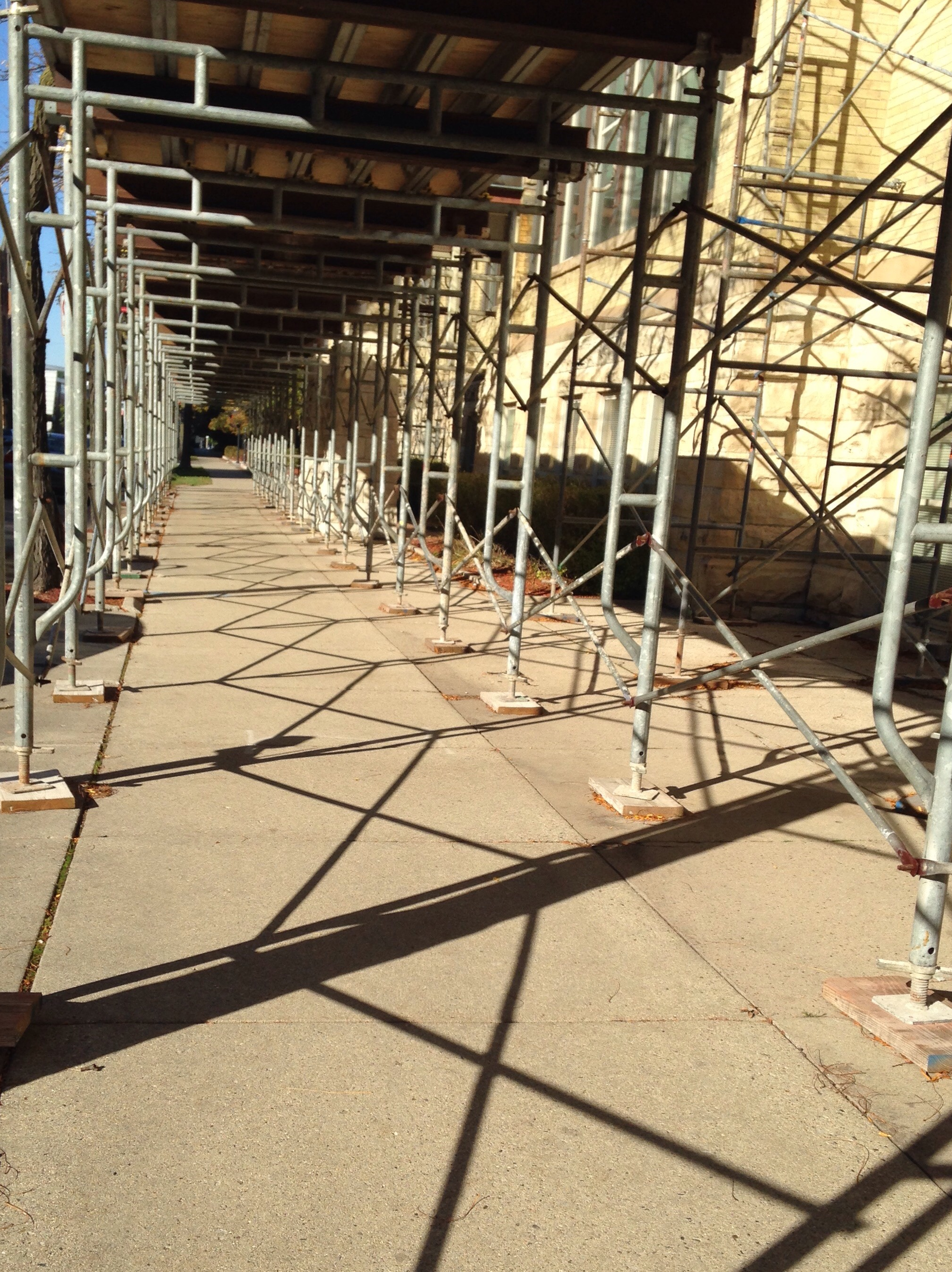 Looks like they’re getting ready to do some repair work on the German-English Academy Building. I was struck this afternoon by the crisscrossed geometry of shadow and scaffolding (hence the pic πŸ™‚ )