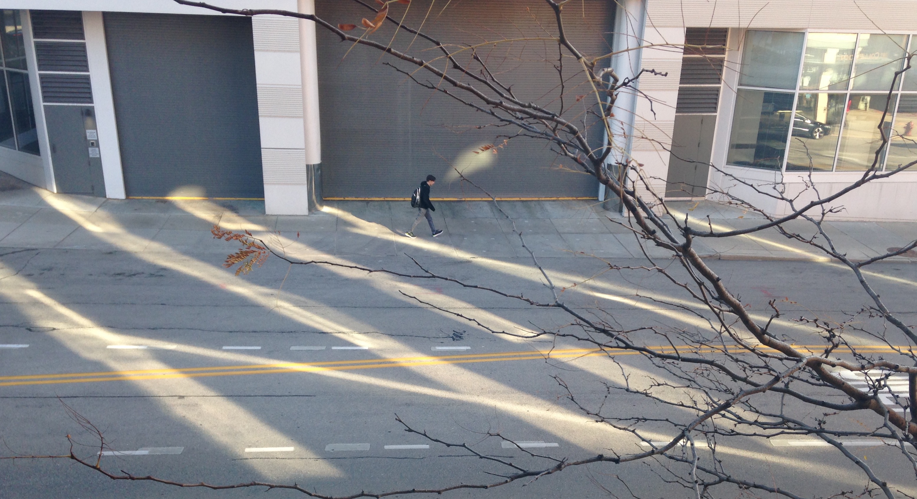 This was the view from my office window yesterday afternoon. Bright sun, despite the wind and falling temperatures. I liked the way sunlight reflecting from my building’s windows cast long fingers of light across the street.