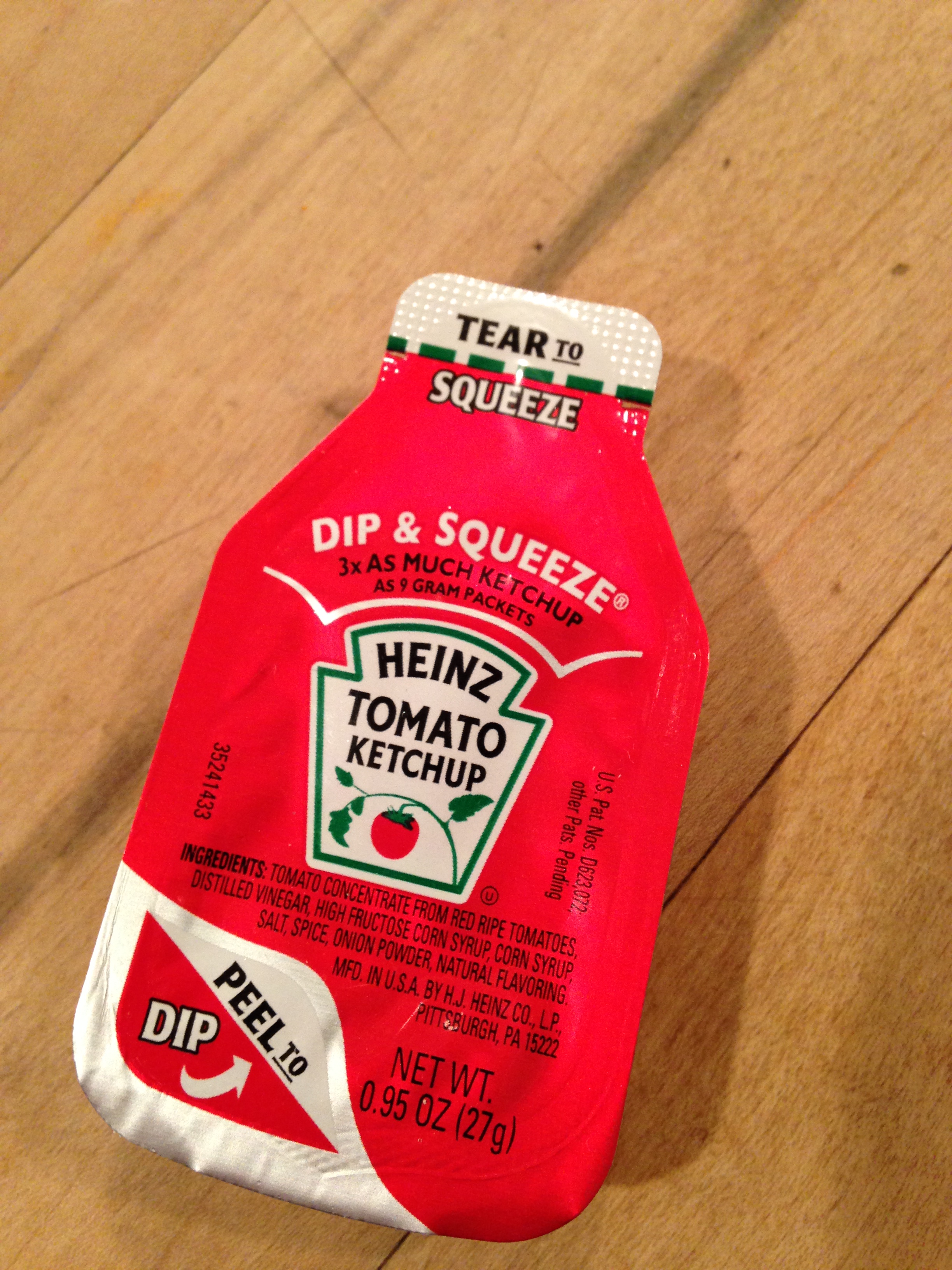 This is really small in the grand scheme of things, but still I’m super impressed with Heinz’s new ketchup packet. My younger daughter had a doctor’s appointment the other day, and on the way home we stopped at Culver’s. This is what she got with her onion rings.