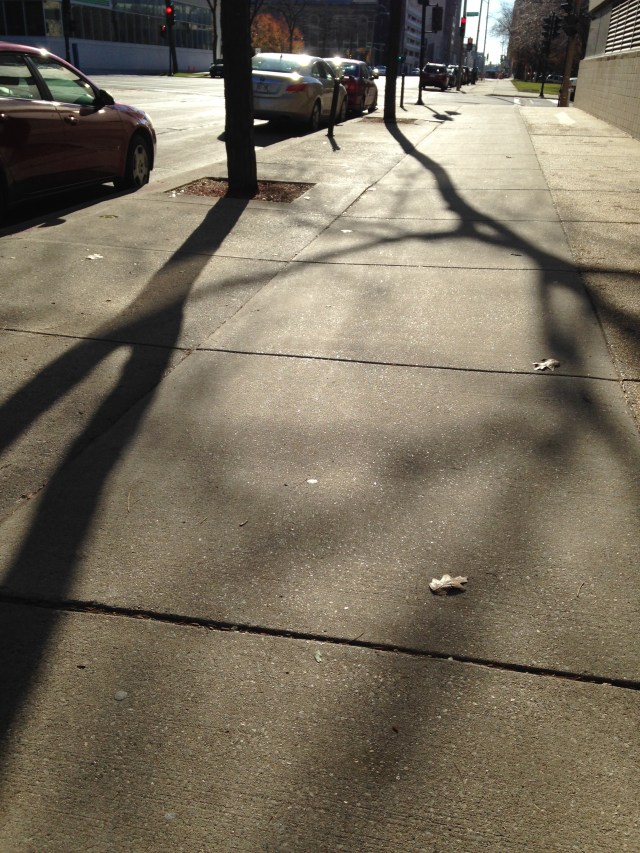 Actually, I think I just figured it out, but sadly it’s now almost 1:00 pm, so there’s no chance to check my theory out. I’m guessing that the fainter shadows are the result of sunlight reflecting off the glass of the Grohmann Museum’s atrium and then casting shadows of those branches from a different angle and with a weaker light. I suppose that might also explain the strangely gauzy quality of sunlight, as well.
