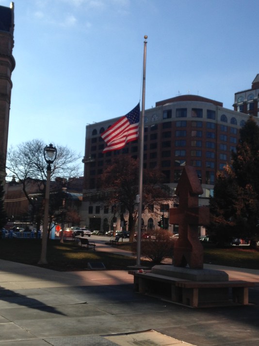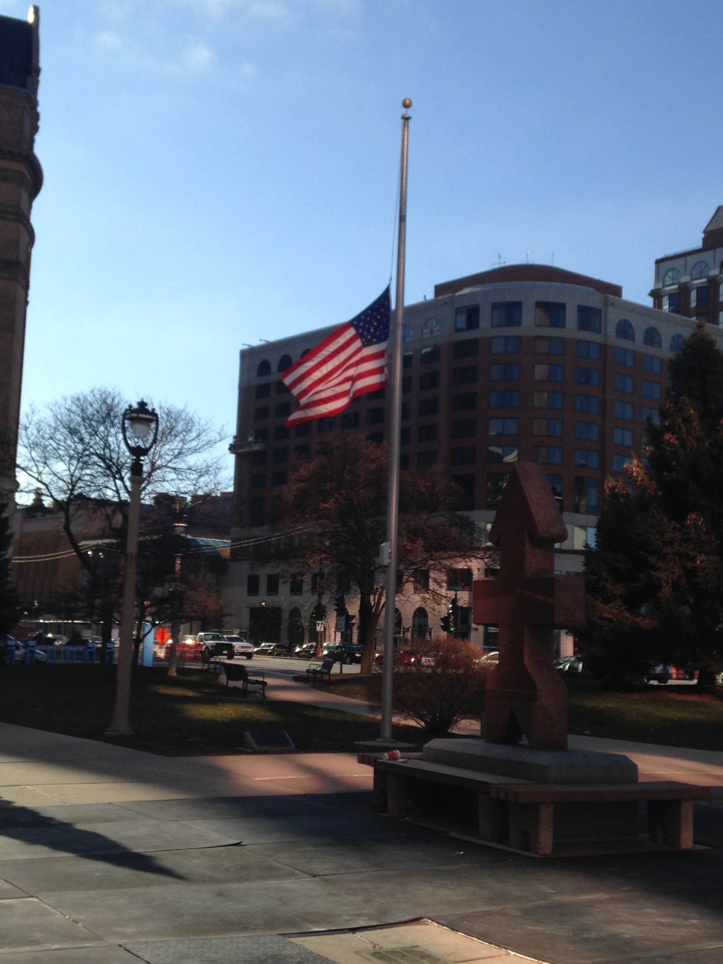 My first reaction upon seeing the flag at half mast in Milwaukee’s Red Arrow Park this morning was: “Oh no! What happened?”
