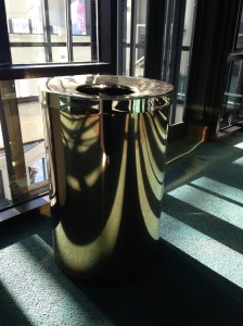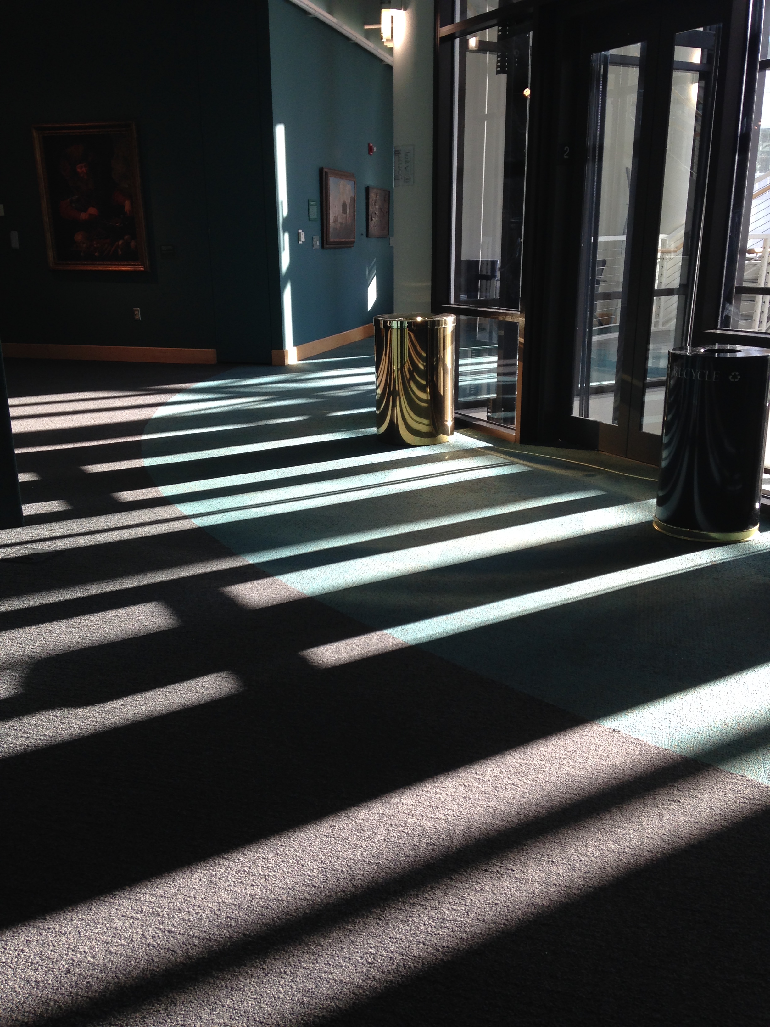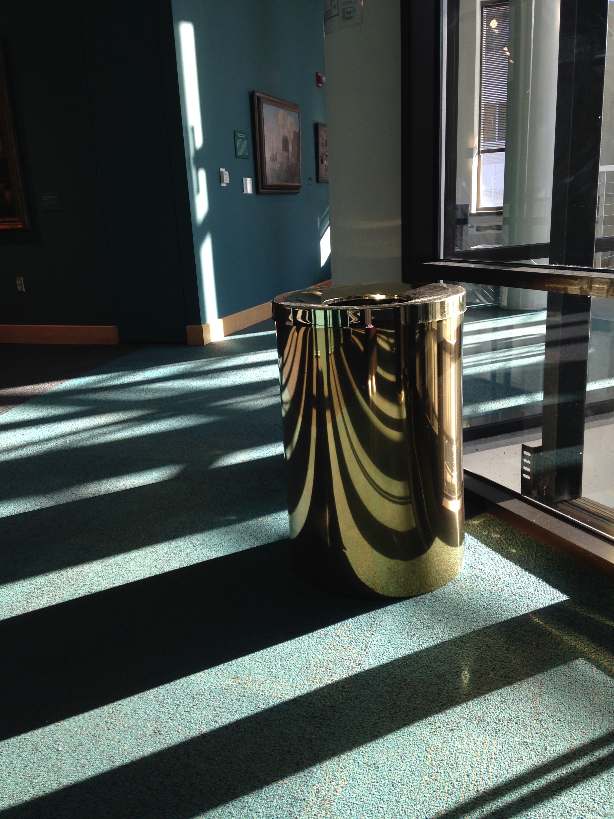 Like a zebra or tiger, this garbage can’s “disruptive coloration” stripes allow it to blend in with its environment . . . at least during the time of day that afternoon sun pours into the Grohmann Museum via its four-story atrium, casting shadows like long fingers stretching into the galleries.