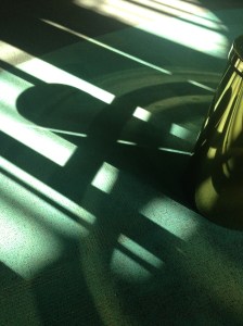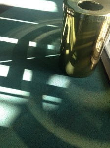Then this one (actually two slightly different photos in quick succession, just in case 🙂 ) on my way out of the building for class late this afternoon, which is sort of a variation on one I took several weeks ago (same subject, different light). The light comes in through the atrium and glass elevator shaft, so I had about two seconds to grab the shot(s) before the elevator arrived and blocked the light.