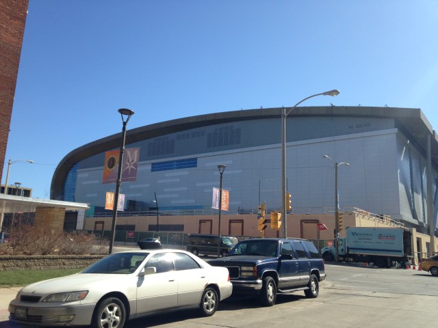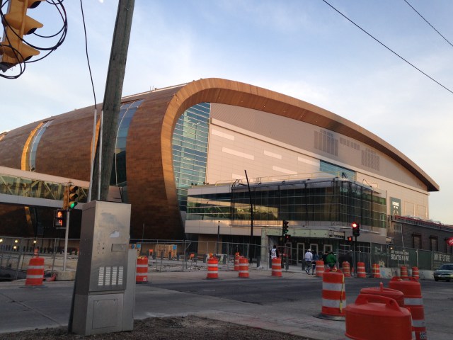 Street construction on my usual route to work has me driving past the new Milwaukee Bucks arena from different directions and at different times of day than usual. These literal shifts in perspective have led me to discover something kind of cool: the walls of the arena change color depending on the light.