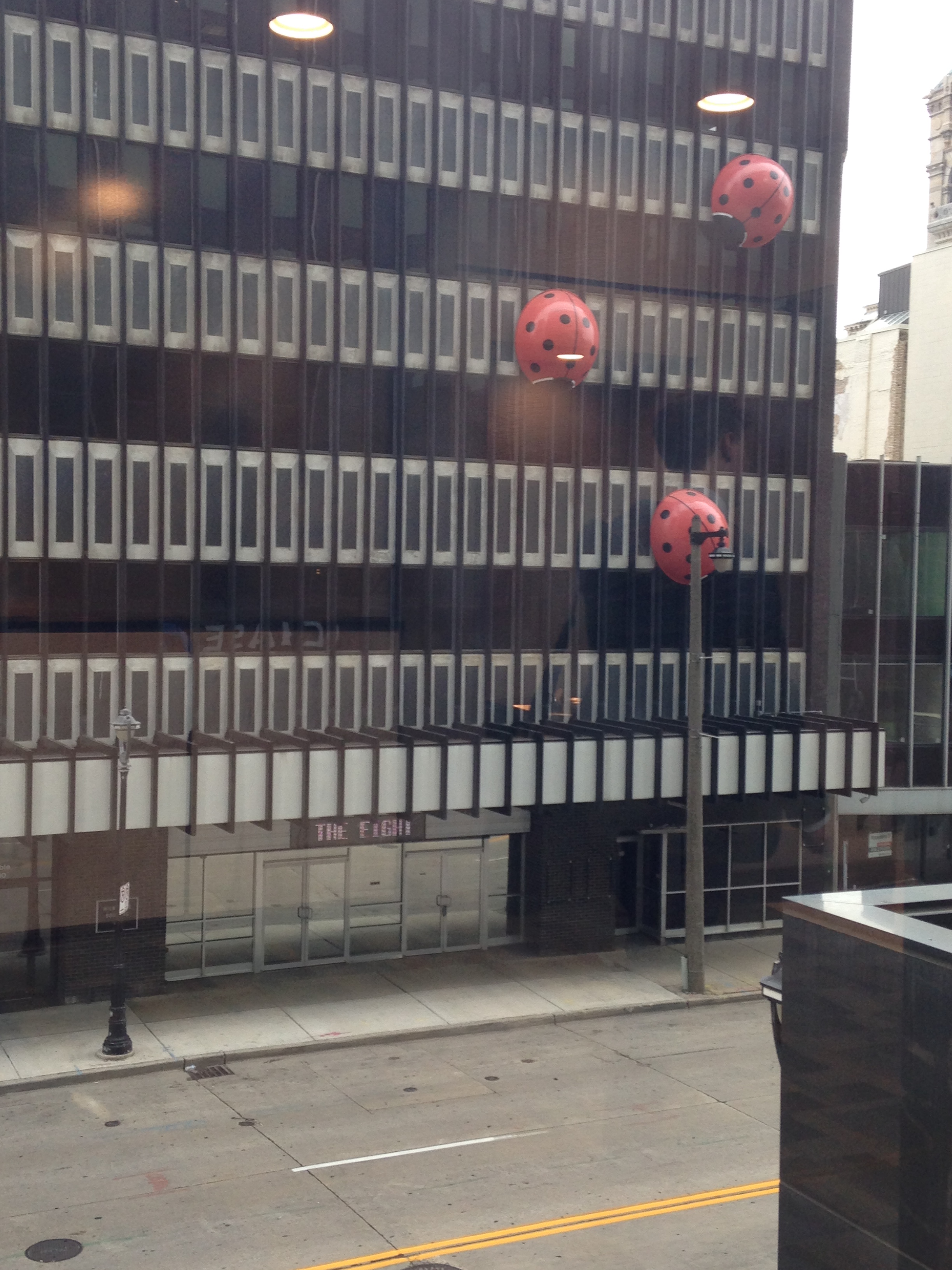 On the way back I paused on the second-floor landing of the Chase Tower to take a picture of the giant ladybugs crawling down the building across the street to text to my daughters. (Sorry about all the reflections; I was indoors and the lights behind me showed up pretty prominently on the glass of the window I took the photo through. You can even make out the guy sitting on the bench next to me who was talking on his phone. He’s right there behind/above/around the lowest ladybug.)