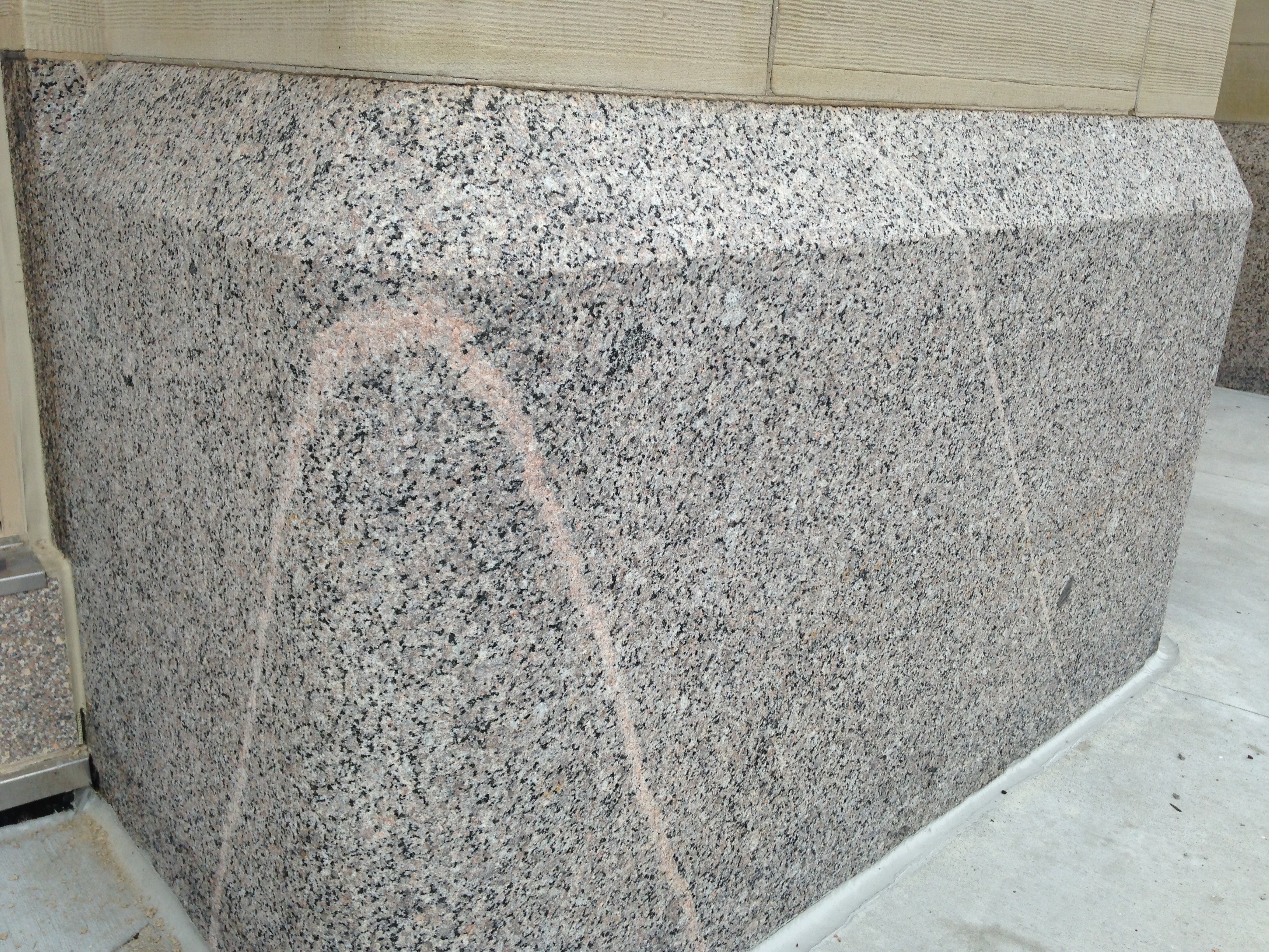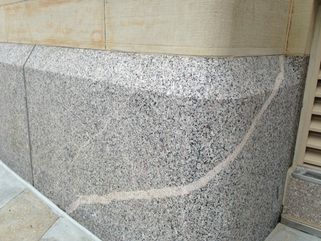 Then, speaking of stone, as I was walking past City Hall, where they’re currently doing the latest installment of the never-ending construction/restoration this beautiful-but-high-maintenance building requires, I noticed what appeared to be repairs to cracks in the granite base. Oh no, I thought, now the building is starting to fracture. Took me a minute to realize, duh!, that these are natural veins in the rock itself.