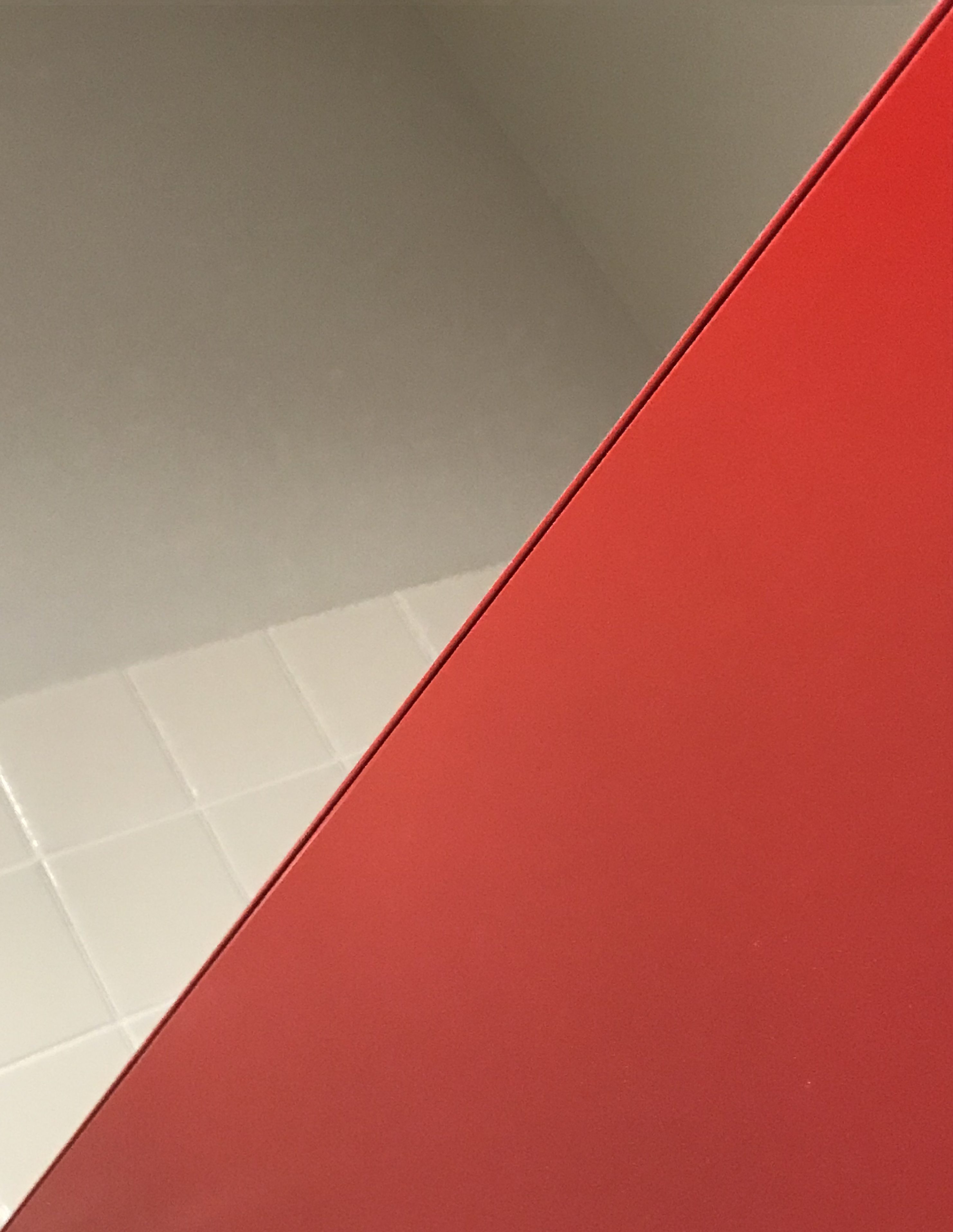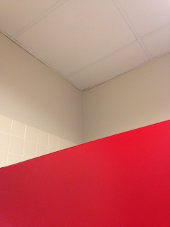 Tell the truth. If you saw this photo and didn’t know what it was, would it still scream out “BATHROOM STALL”? Not that it really matters, I guess. I liked that red, and I liked the lines. So then I took another one just to change it up a little. I don’t know; the red is way too dominant. Maybe if there was more light so the other side would balance out the red’s intensity? And I would need to bring my good camera to work one day so I could get a sharper focus.