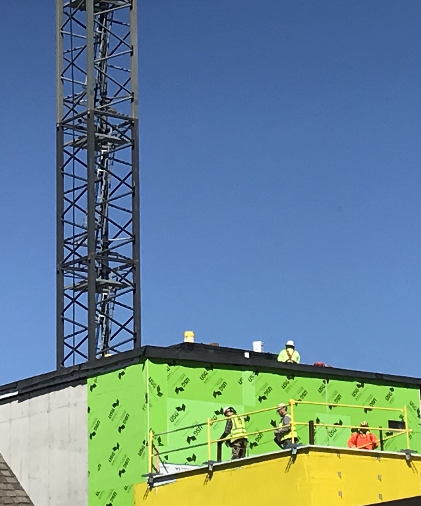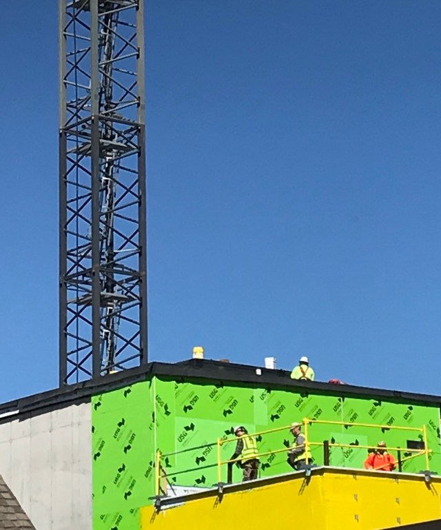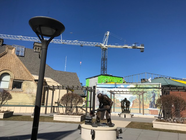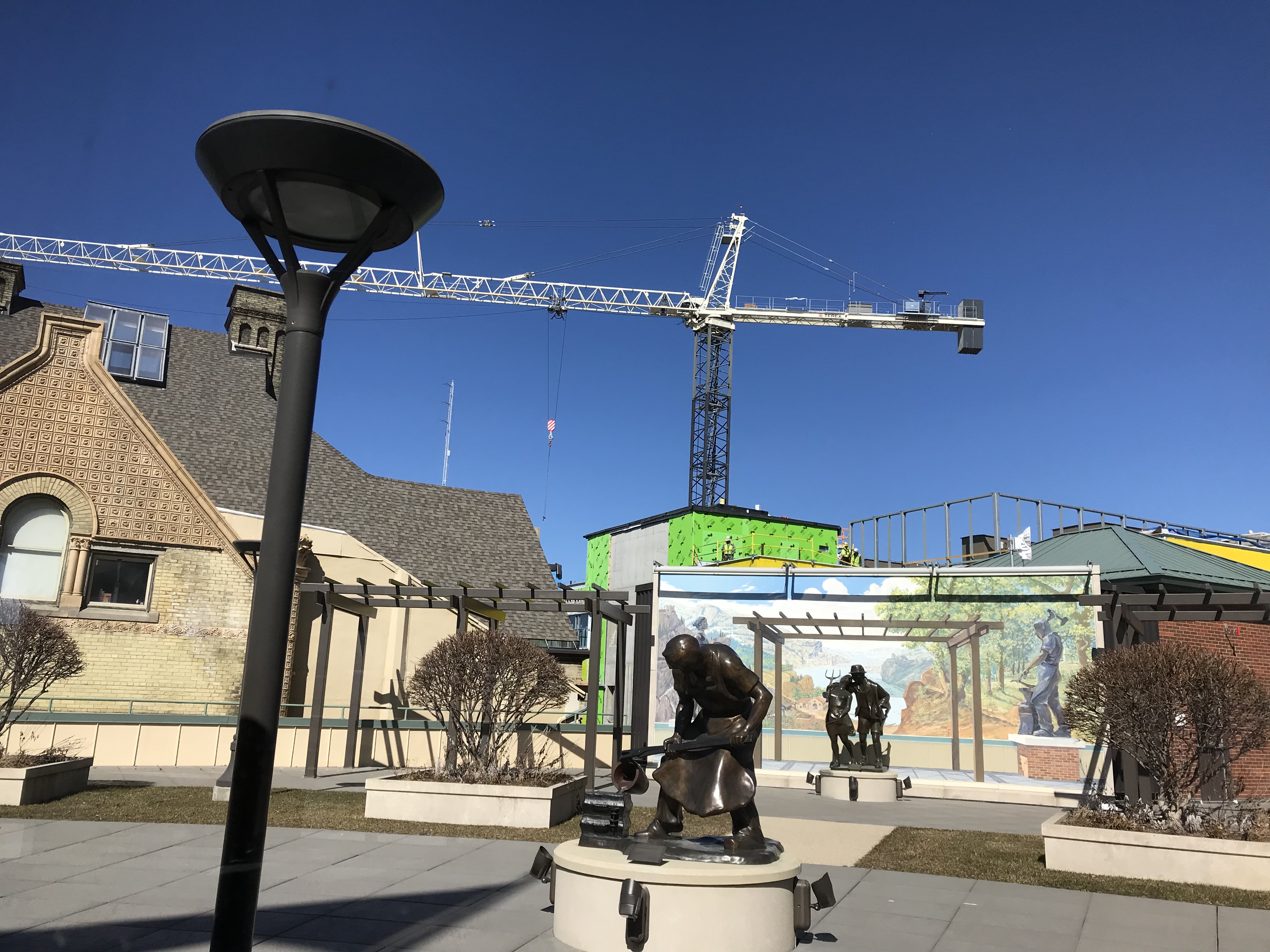 Set to house Milwaukee School of Engineering’s AI program, Diercks Hall will open this coming fall. As I reached the top of the staircase during my rounds yesterday, the bright colors of construction workers’ vests and the yellow/green material covering the walls (insulation? vapor barrier? something else???) caught my eye across the finally snow-free sculpture garden. A cheerful sign that progress was achieved during the cold, gray days of our Wisconsin winter—and a reminder that “slow and steady” wins the race, even when conditions are far from ideal.