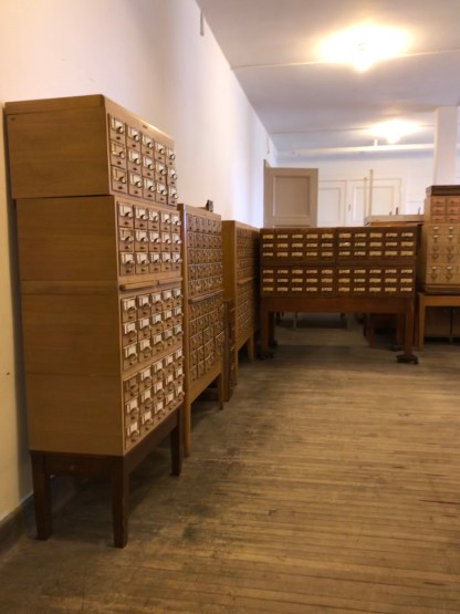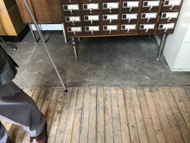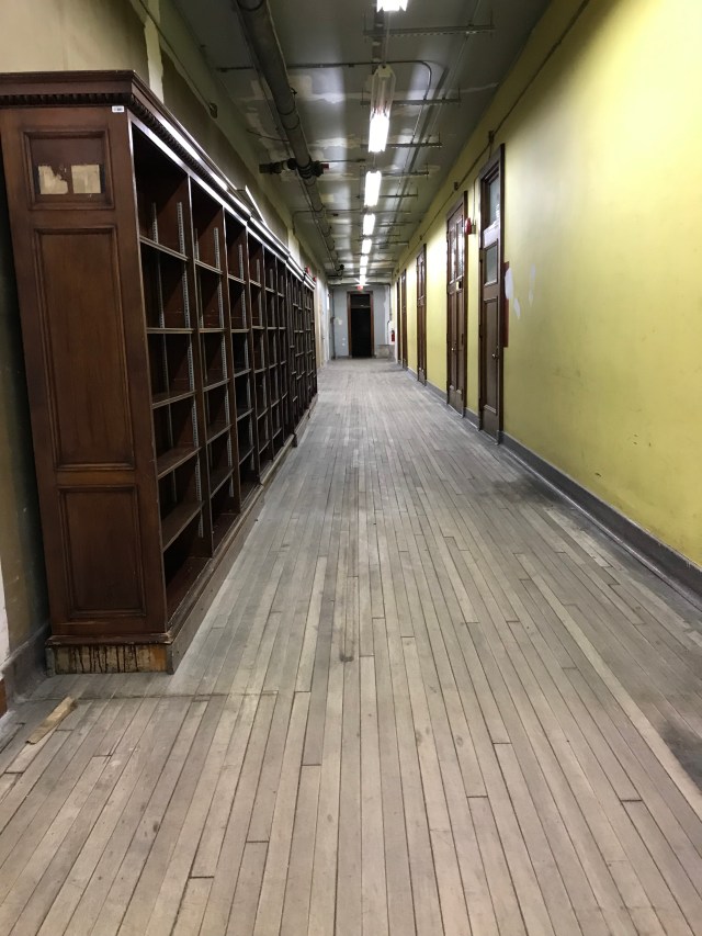 After the lecture/slideshow in the rare books room ended, the attendees split into three small groups for librarian-led tours of the old Public Museum spaces. When we went up to the fourth floor, Dan Lee, the librarian leading our tour, brought out a replica bowling ball that several librarians chipped in to buy several years ago and suggested that one of us on the tour throw it down the hall. Someone did . . . and it really did look and sound just like a bowling alley, with the granite baseboards acting like bumpers. Here are some photos I took of that hallway up on the fourth floor, currently used for storage but originally home to the Museum’s taxidermy and geology departments as well as the super-cool, 19th-century-looking office of the director. Doesn’t that hallway look like a bowling alley with that thin-planked hardwood floor?