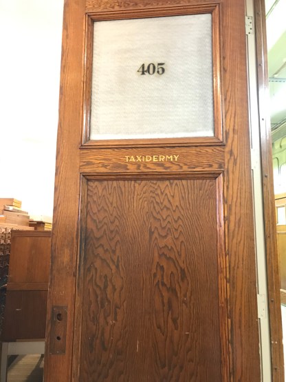 But there are remnants of the old taxidermy room. There’s a boarded-up opening in the ceiling where winches were once used to raise/lower larger specimens (like elephants) into the room or out to the roof. And there’s the stone slab inset in the floor, where specimens were gutted (easier to clean than the hardwood floors).