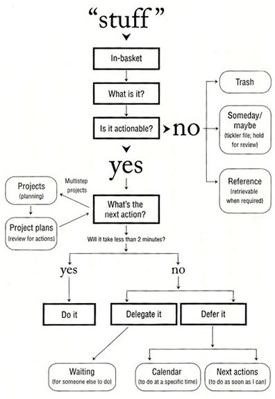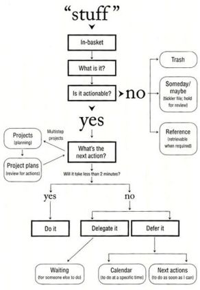 OMG, so am I! I discovered and bought the Getting Things Done book a couple years ago after reading in another book Drew Carey’s account of how David Allen and his book saved his career. I found that other book (Willpower: Rediscovering the Greatest Human Strength) in Google Books, and I think this link will take you right to that section so you can read it yourself. Carey’s story is super inspiring (gee, even successful people struggle with organization!) and a super-strong testimonial to David Allen’s list-and-folder time/project-management technique. I’m still a work in progress, but after reading through the book multiple times to reinforce my actual practice, I’ve finally internalized Allen’s methods and feel far more in control of my life since I began trying to use the flowchart in his book.