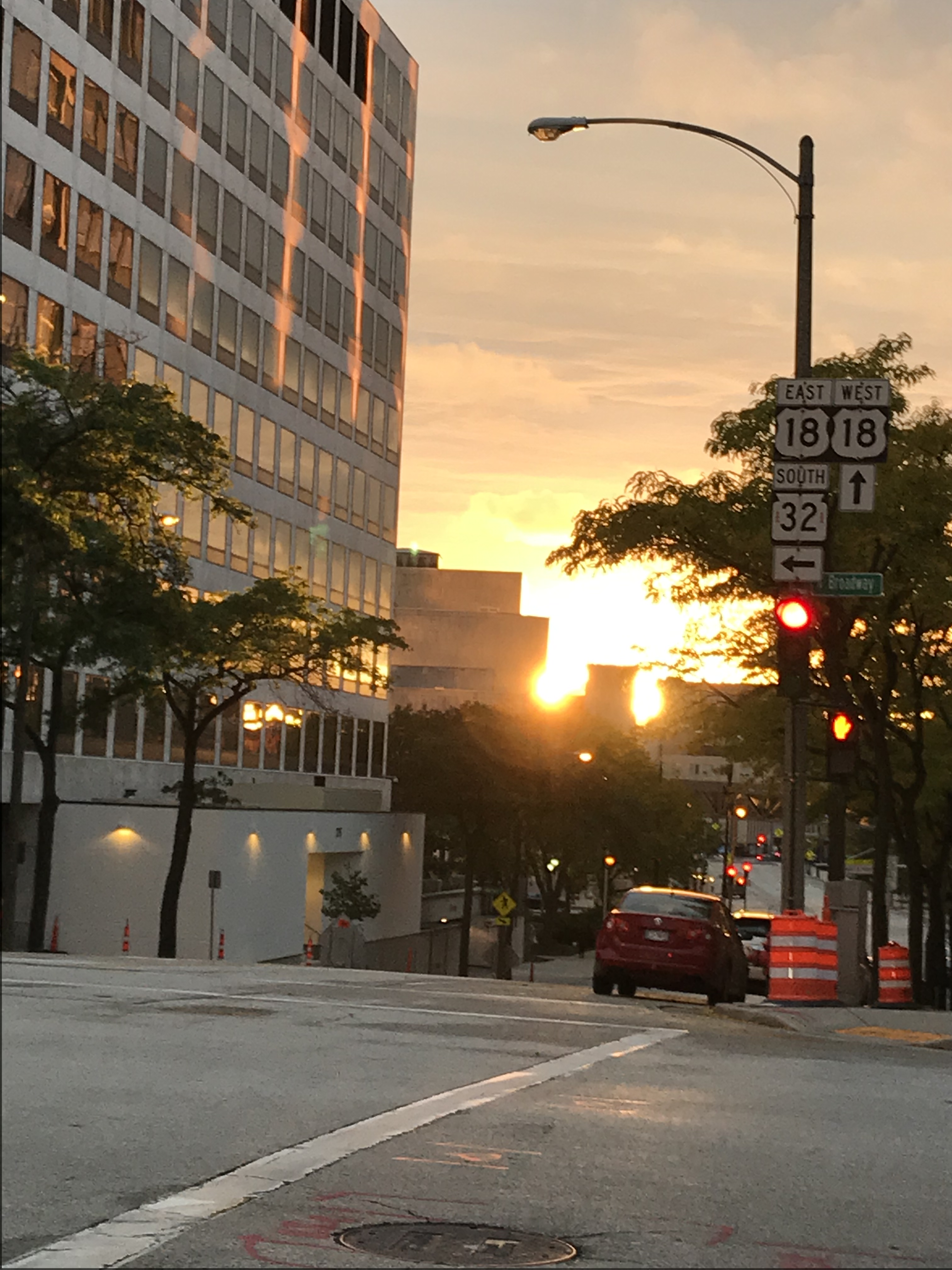 Taken tonight as I was leaving my office. I wanted to shoot a panorama so you could see the beautiful glow of all that orange light reflected and reflected again off of office building windows and down onto the streets and the MGIC grassy mall area and trees.