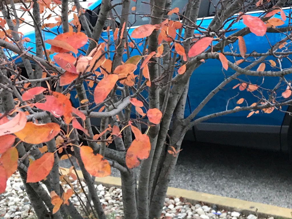 I took this picture about two weeks ago, as I was pushing my cart out of the grocery store. The red leaves against that blue car made such a striking color combination that I discreetly pulled out my phone and took a couple photos. Then I realized that the car’s owners were right behind me. Oops! But they were busy talking and didn’t say anything to me nor even pause their conversation. Just got into their vehicle, still talking, and drove away. Whew! I’m glad I didn’t have to explain why I was taking a picture of their car. Although, as you can see, I wasn’t really going for their actual car so much as I wanted that blue background for the red leaves. Luck strikes again. Because had I chosen a different checkout line in the store, I might have come outside a minute later, the car would have been gone already, and I’d have missed my chance to see this fabulous pairing of colors!