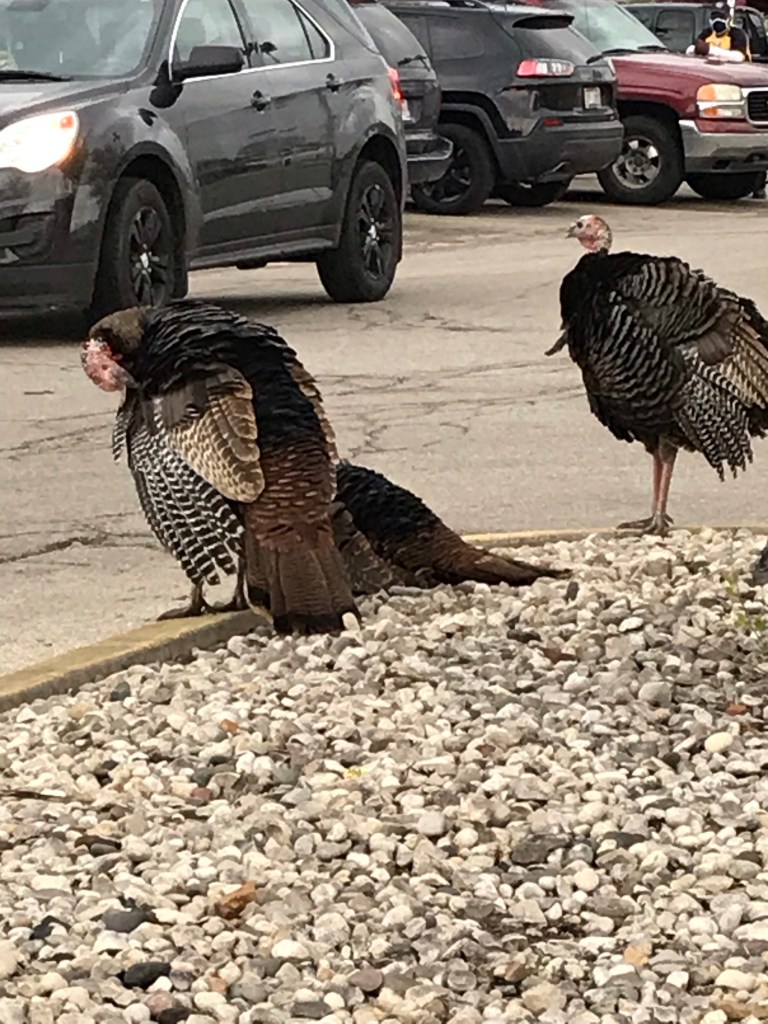 I took this photo a few days ago in my local grocery store’s parking lot, where three wild turkeys stood guard near the entrance.