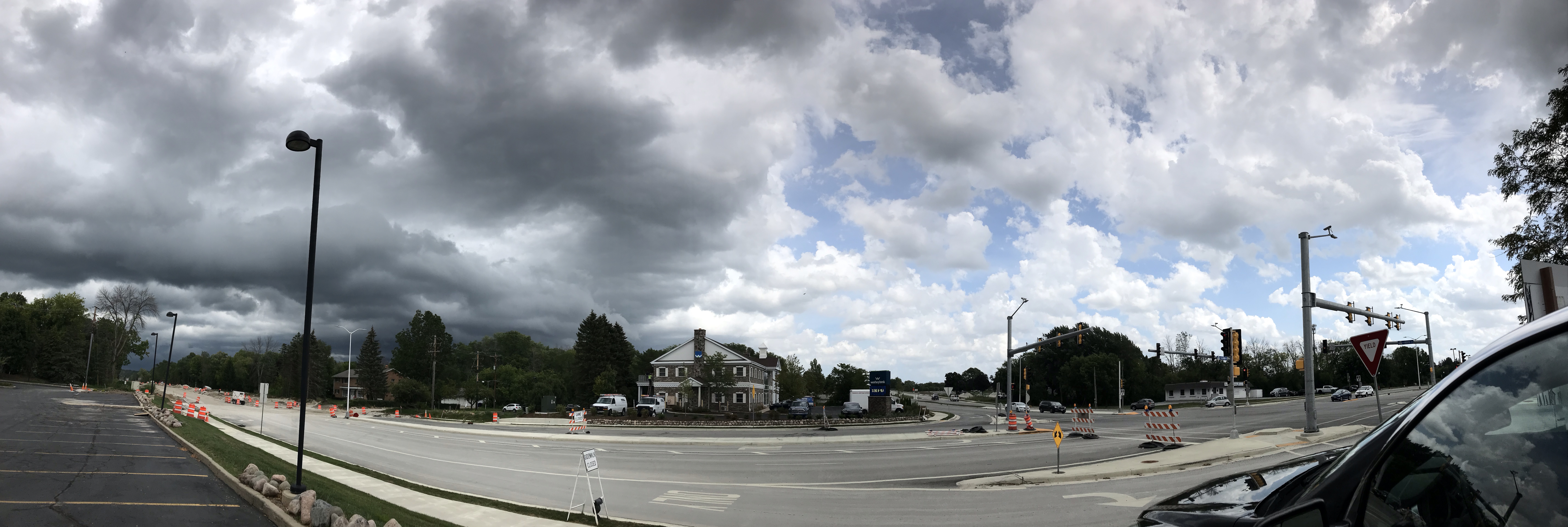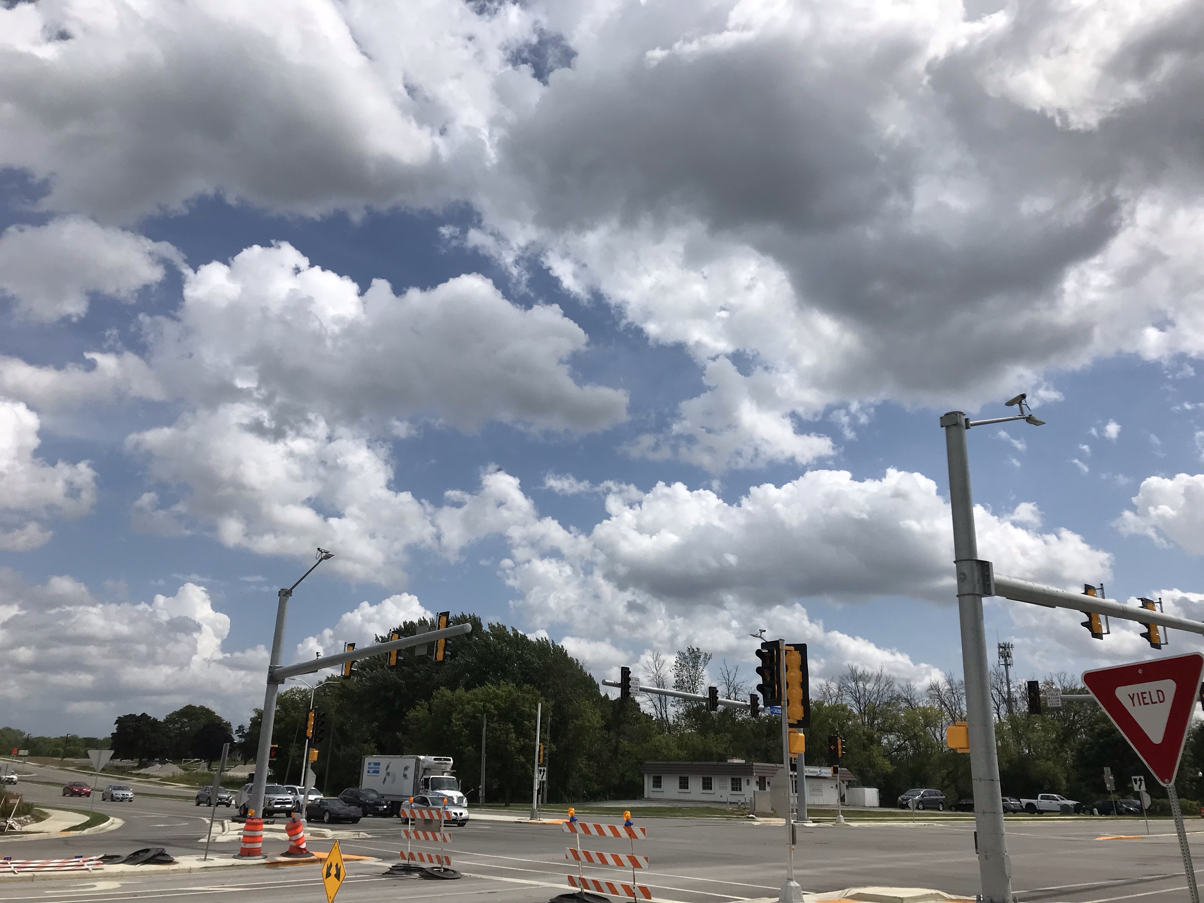 As I was getting some work done in the front seat of my car, I looked up and out through the windshield at one point, noticing as I did that the sky to the south (my right) was sunny and blue, with big fluffy white clouds.