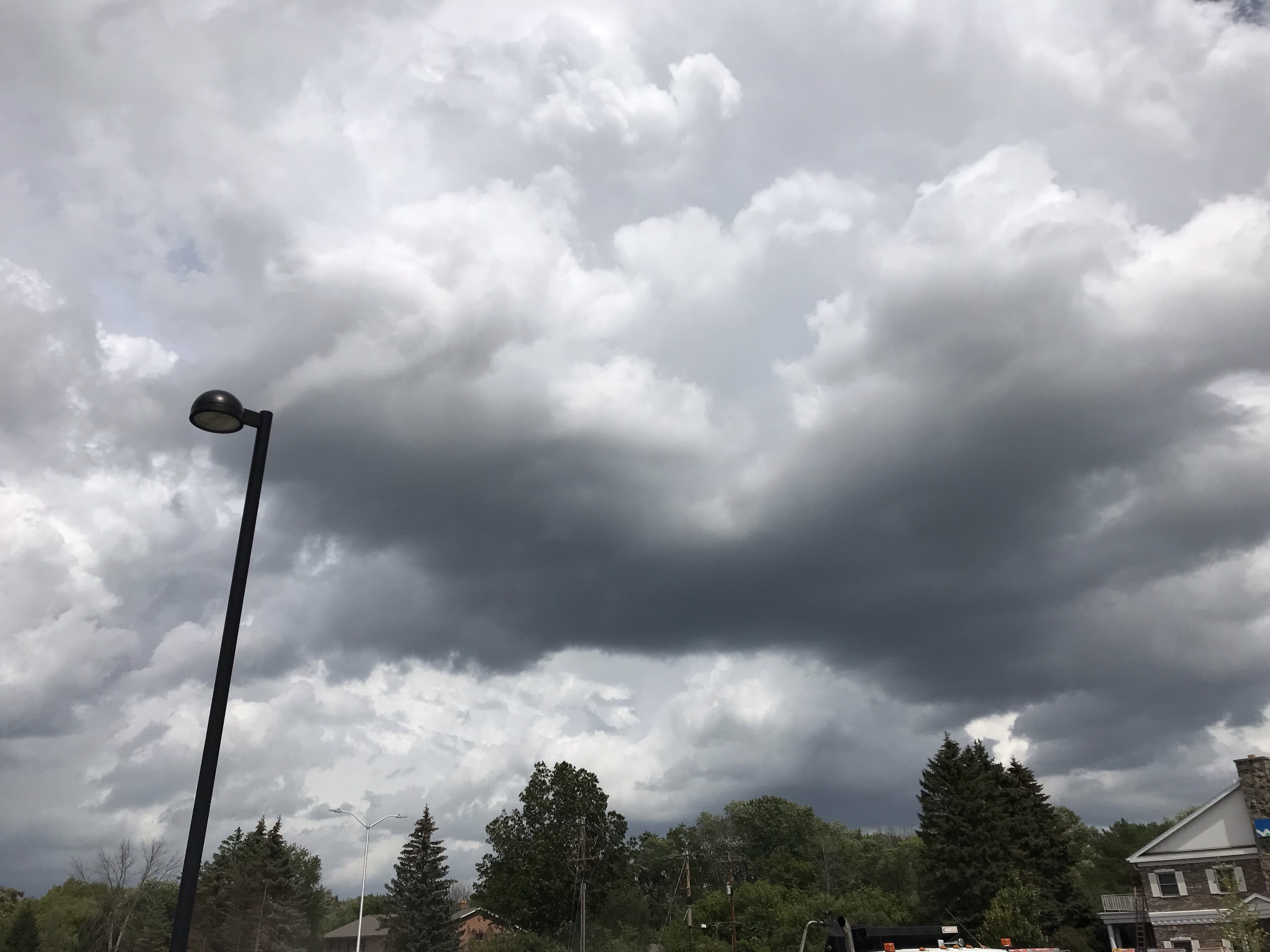 The sunny clouds to the south (my right) were moving to the east, leaning north. The dark clouds to the north (my left) were also moving to the east, but leaning south. I wondered what would happen when they ran into each other.