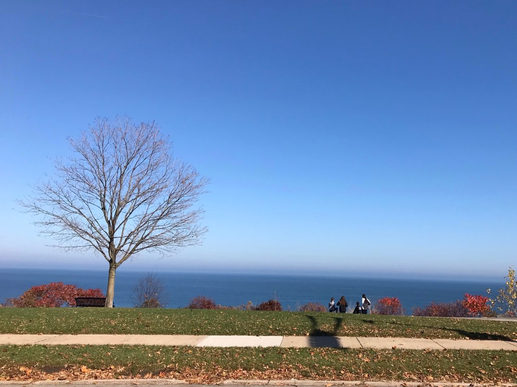 I took this picture on the way home, while stopped at the traffic light where Capitol Drive hits Atwater park in Shorewood. I loved the deep blue of the lake and that distant hazy area where the air and water temperatures blurred together in a horizon-obscuring fog. Add in the strip of yellow leaves along the curb, the red bushes dotting a row along the bluff top, the lone, leafless tree at left, and that small cluster of teenagers taking it all in—well, I had to hurry up and roll down my window to take a quick photo with my phone before the light changed!😀