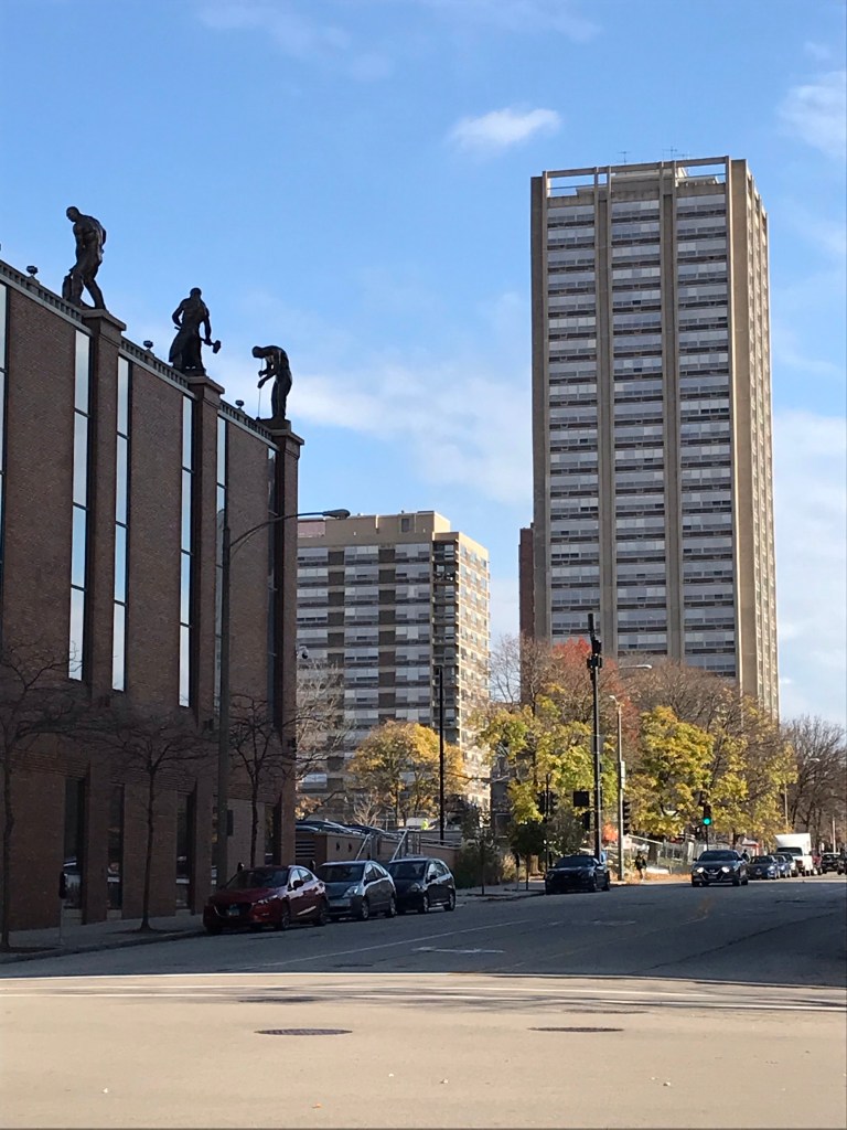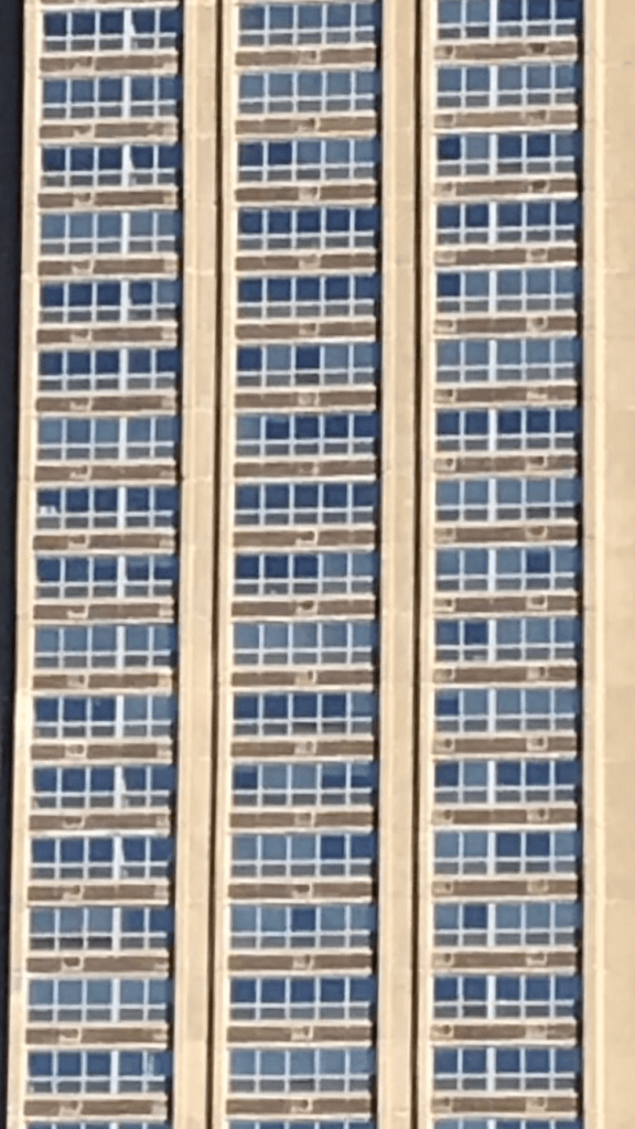 This post is a follow up to yesterday’s. I made another coffee run down the hill to Starbucks this morning. I think it was earlier in the day, so the sun was at a different place in the sky and hit the Juneau Village Towers at a different angle. Today the building is much truer to the usual brown and gray coloring. It’s so interesting to me that reflected light could fool my eye so much as it did, minimizing the brown and gray and creating an overall impression of “blue.”