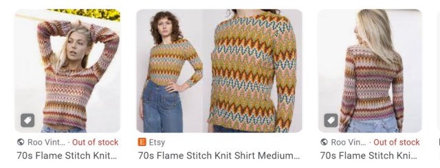 I thought this vaguely zigzagged look was from the early 1970s. Lots of girls at my junior high school wore knit sweaters in this pattern, and I thought it was the coolest, most mesmerizing psychedelic design ever.