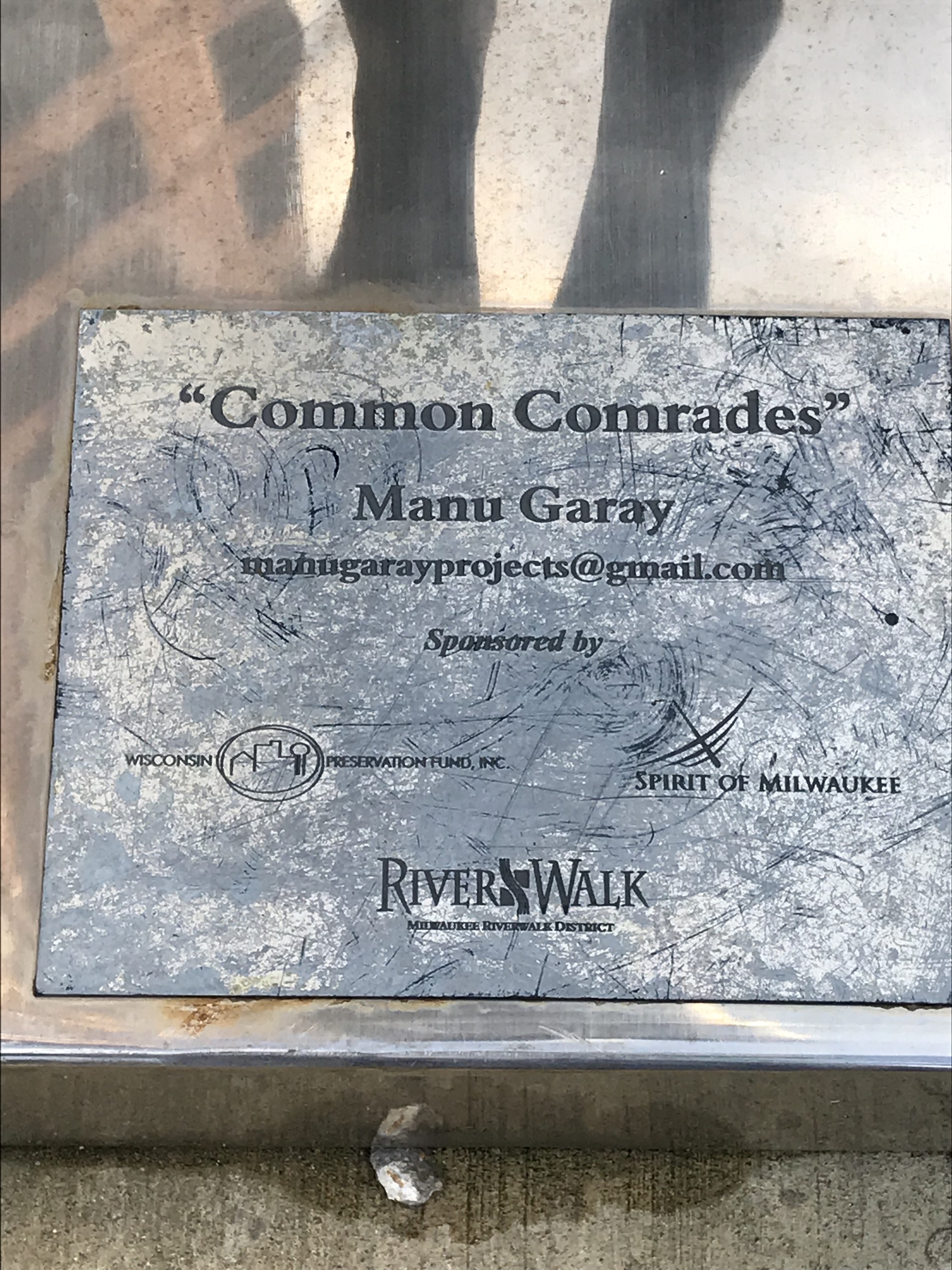 I don’t know anything about the artist, Manu Garay. Text accompanying a flickr photograph of the sculpture mentions him as a “local artist.” I did find someone on LinkedIn named Manu Garay, based in Milwaukee, so that person may be him. His education is listed as MIAD, which is the Milwaukee Institute of Art and Design, an additional “clue” that logically seems to point toward this LinkedIn person being the creator of Common Comrades. The LinkedIn profile also lists a “freelance design” website URL, but when I clicked through, I got a “this site can’t be reached” message.