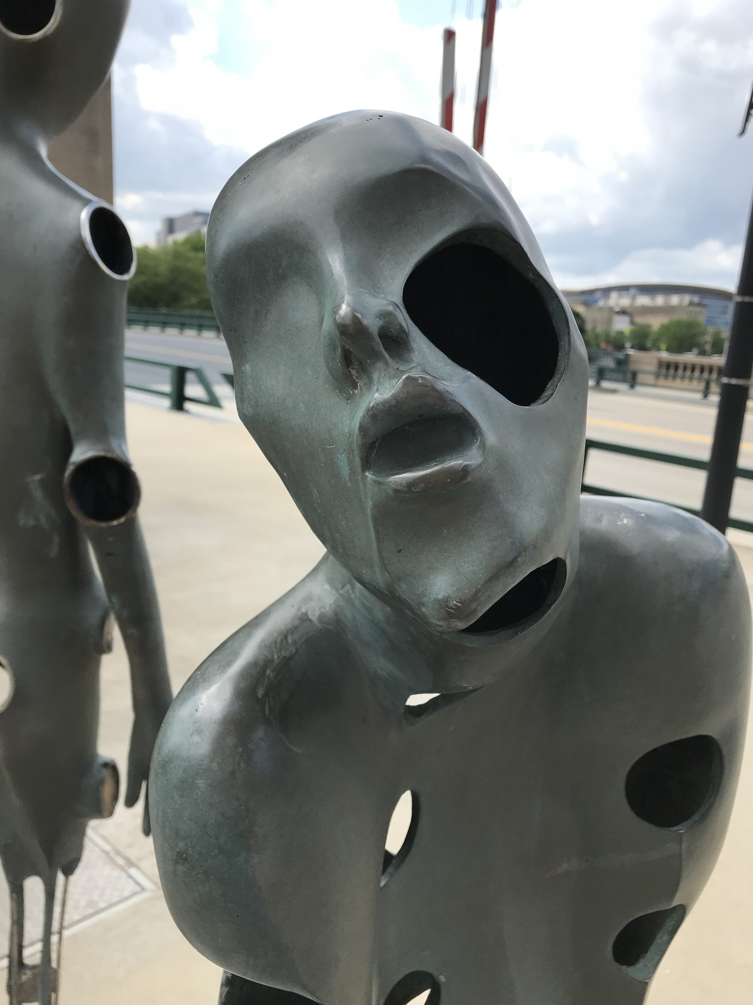 I wanted lots of mournful, haunting words, for example. And I wanted the figures to speak in some way, even if nothing more than to offer silent testimony on ideas like the emptiness of the void, the omnipresence of evil (the type so banal that we don’t even see it), and the callousness of our ignorance. The figures in this sculpture are absolutely horrifying up close. Yet the sculpture sort of fades into the woodwork (so to speak) of its busy surroundings, in a spot seemingly “tucked away” in a nook next to one of the four bridge house pillars on Kilbourn Avenue, a major east-west downtown street that hundreds, if not thousands, of people drive and walk past every day. Maybe that adds to the horror, the fact that it occurs in such an unobtrusive way in such a high-traffic setting.