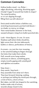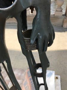 In addition to “haunting” words, I wanted my poem to have a “kaleidoscopic” feel that would mimic the experience of needing to walk all around the figures (which are different heights and are facing in different directions), standing alternately far away and then coming in close again, to view everything there is to see and to take in the sculpture as a whole. Plus, I liked the paradoxes embodied in this sculpture: sightless eyes, silent screams, missing arms and legs, and “prosthetic” arms and legs resembling crutches or braces for use with limbs that aren’t missing as these are. I liked the paradoxes, mind you, not the actual horror of sightless eyes and silent screams. Just so many details and perspectives happening all at once as you experience this artwork, which to me seems very kaleidoscopic. Always changing, always shifting perspectives.