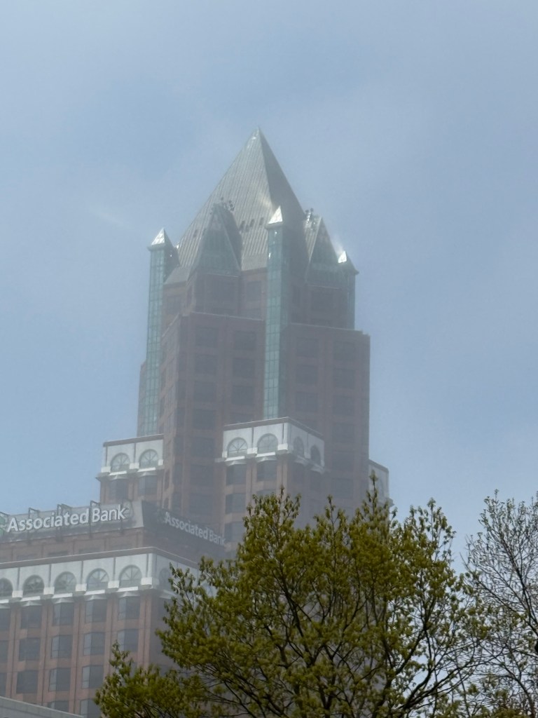 The area closest to Lake Michigan this morning was blanketed with fog. You basically couldn’t see the top half of any office buildings east of the river. This building, the same one I posted a picture of the other day, is right on the river, literally on the eastern bank. So, close-ish to the lake but several blocks away.